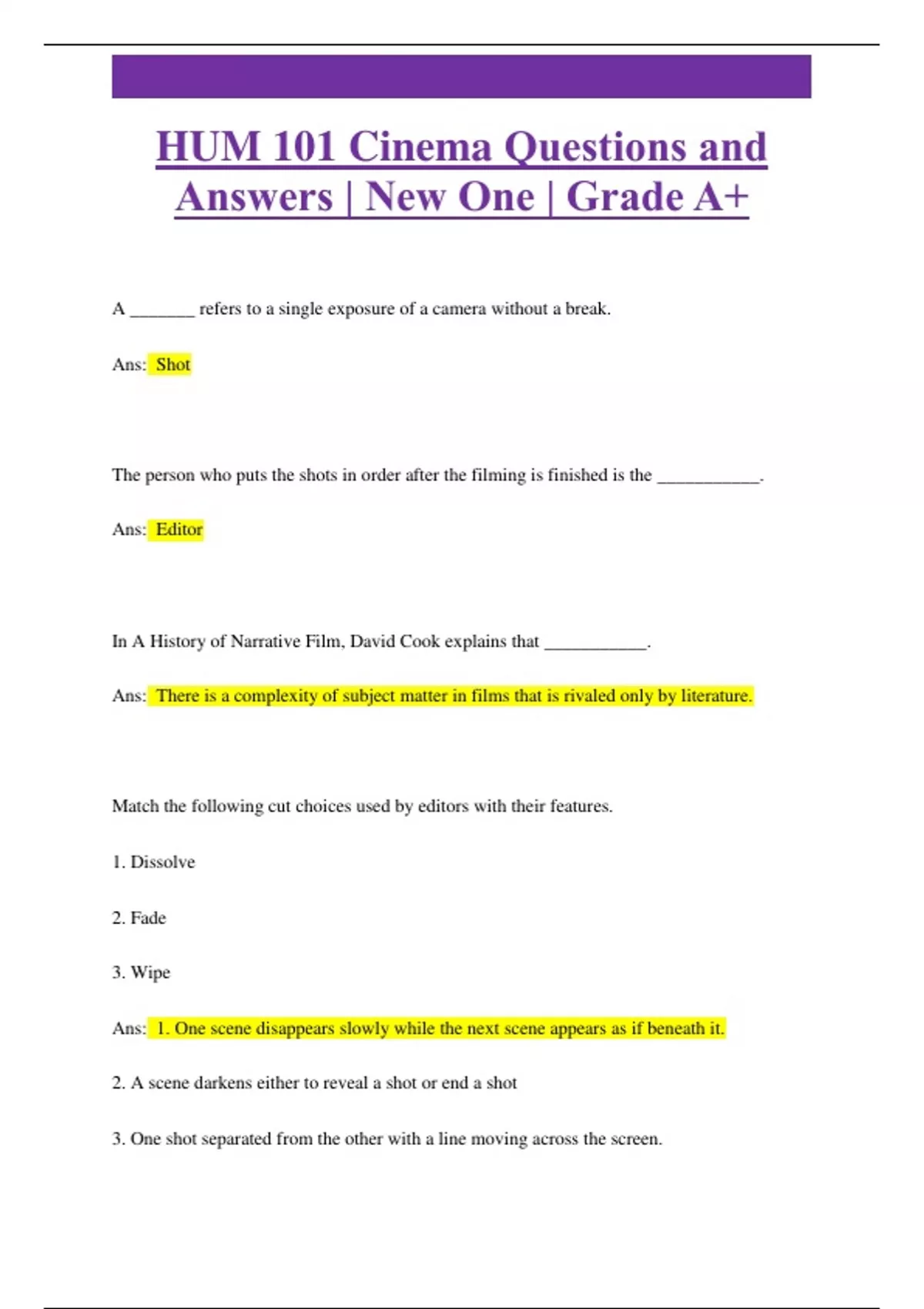 HUM 101 Cinema Questions and Answers | New One | Grade A+