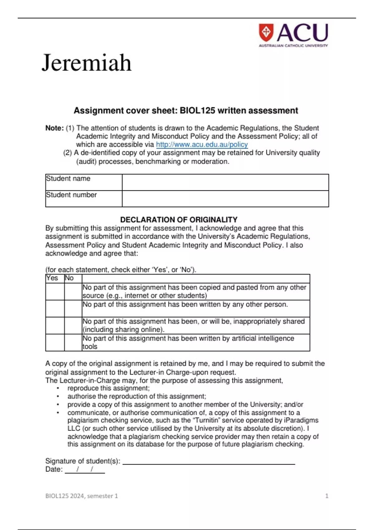 Assignment cover sheet: BIOL125 written assessment