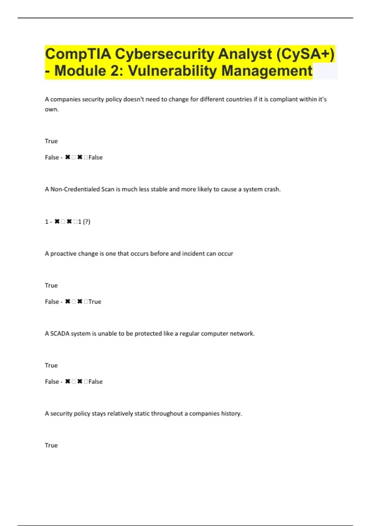 A companies security policy doesn't need to change for different countries if it is compliant within it's own. True False - ️️False A Non-Credentialed Scan is much less stable and more likely to cause a system crash. 1 - ️️1 (?) A proactive change is one that occurs before and incident can occur True False - ️️True A SCADA system is unable to be protected like a regular computer network. True False - ️️False A security policy stays relatively static throughout a companies history. True