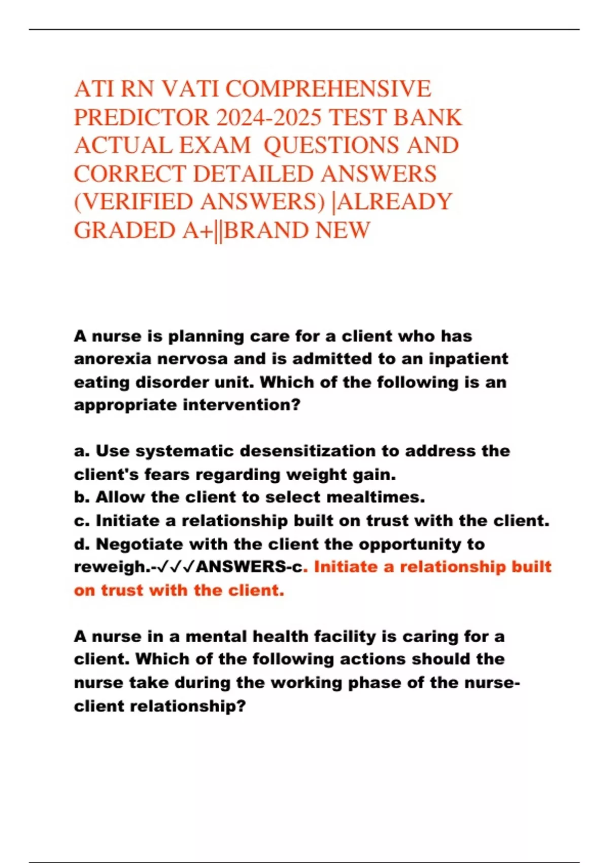 ATI RN VATI COMPREHENSIVE PREDICTOR TEST BANK ACTUAL EXAM QUESTIONS AND CORRECT DETAILED ANSWERS (VERIFIED ANSWERS) |ALREADY GRADED A+||BRAND NEW A nurse is planning care for a client who has anorexia nervosa and is admitted to an inpatient eating disorder unit. Which of the following is an appropriate intervention? a. Use systematic desensitization to address the client's fears regarding weight gain. b. Allow the client to select mealtimes. c. Initiate a relationship built on trust with the client. d. Negotiate with the client the opportunity to reweigh.-ANSWERS-c. Initiate a relationship built on trust with the client. A nurse in a mental health facility is caring for a client. Which of the following actions should the nurse take during the working phase of the nurse-client relationship?