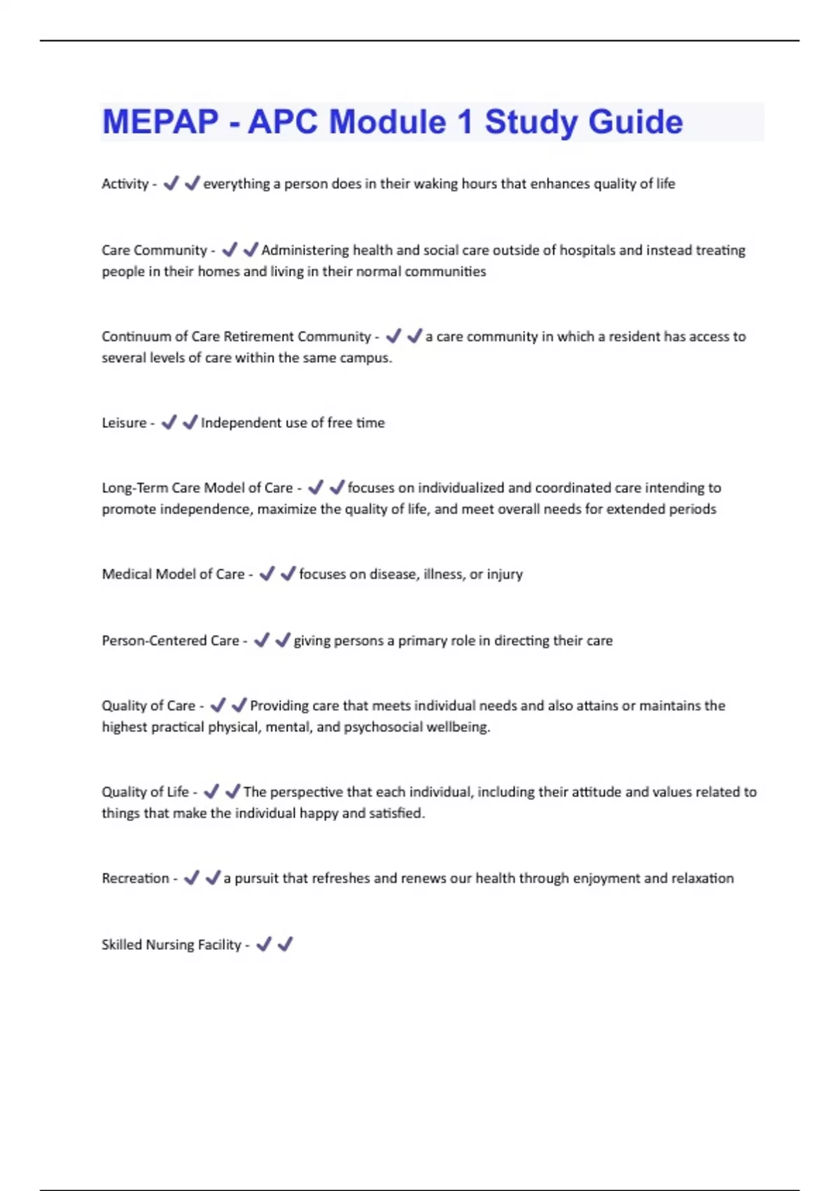 Activity - everything a person does in their waking hours that enhances quality of life Care Community - Administering health and social care outside of hospitals and instead treating people in their homes and living in their normal communities Continuum of Care Retirement Community - a care community in which a resident has access to several levels of care within the same campus. Leisure - Independent use of free time Long-Term Care Model of Care - focuses on individualized and coordinated care intending to promote independence, maximize the quality of life, and meet overall needs for extended periods Medical Model of Care - focuses on disease, illness, or injury Person-Centered Care - giving persons a primary role in directing their care Quality of Care - Providing care that meets individual needs and also attains or maintains the highest practical physical, mental, and psychosocial wellbeing. Quality of Life - The perspective that each individual, including their attitude and values related to things that make the individual happy and satisfied. Recreation - a pursuit that refreshes and renews our health through enjoyment and relaxation Skilled Nursing Facility -Standards of Practice - A list of standards to assist the professional in making good decisions while conducting day to day responsibilities within his or her scope of practice. Therapy - treatment intended to relieve or heal a disorder Wellness Model of Care - focuses on the whole person, especially through the six domains of wellness.