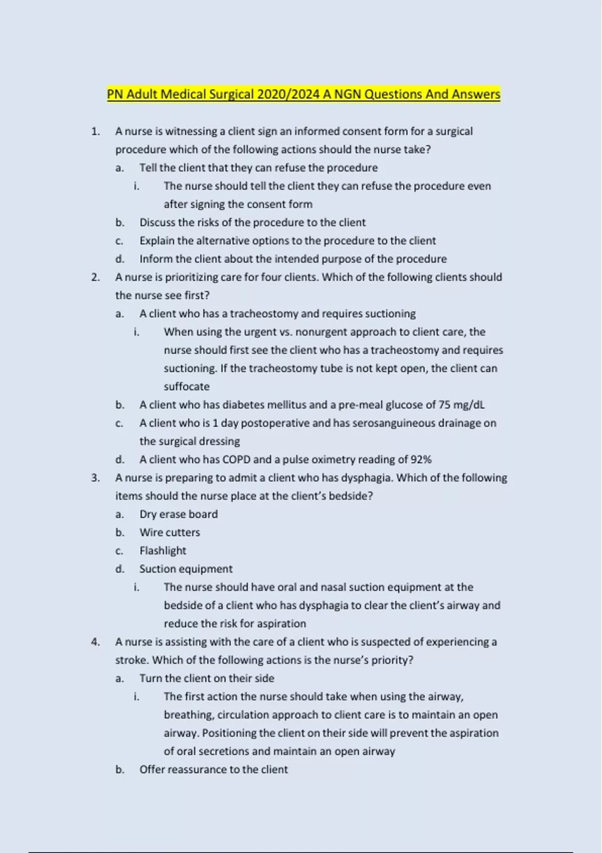 1. A nurse is witnessing a client sign an informed consent form for a surgical procedure which of the following actions should the nurse take? a. Tell the client that they can refuse the procedure i. The nurse should tell the client they can refuse the procedure even after signing the consent form b. Discuss the risks of the procedure to the client c. Explain the alternative options to the procedure to the client d. Inform the client about the intended purpose of the procedure 2. A nurse is prioritizing care for four clients. Which of the following clients should the nurse see first? a. A client who has a tracheostomy and requires suctioning i. When using the urgent vs. nonurgent approach to client care, the nurse should first see the client who has a tracheostomy and requires suctioning. If the tracheostomy tube is not kept open, the client can suffocate b. A client who has diabetes mellitus and a pre-meal glucose of 75 mg/dL c. A client who is 1 day postoperative and has serosanguineous drainage on the surgical dressing d. A client who has COPD and a pulse oximetry reading of 92% 3. A nurse is preparing to admit a client who has dysphagia. Which of the following items should the nurse place at the client’s bedside? a. Dry erase board b. Wire cutters c. Flashlight d. Suction equipment i. The nurse should have oral and nasal suction equipment at the bedside of a client who has dysphagia to clear the client’s airway and reduce the risk for aspiration .....CONTINUES
