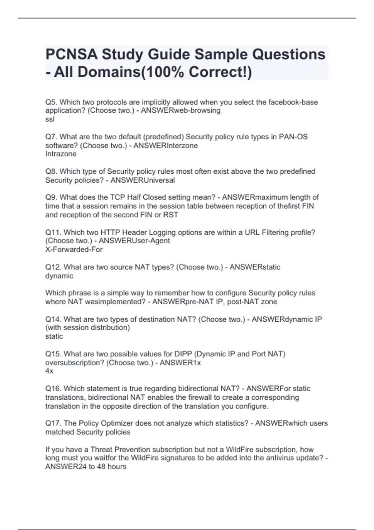 Q5. Which two protocols are implicitly allowed when you select the facebook-base application? (Choose two.) - ANSWERweb-browsing ssl Q7. What are the two default (predefined) Security policy rule types in PAN-OS software? (Choose two.) - ANSWERInterzone Intrazone Q8. Which type of Security policy rules most often exist above the two predefined Security policies? - ANSWERUniversal Q9. What does the TCP Half Closed setting mean? - ANSWERmaximum length of time that a session remains in the session table between reception of thefirst FIN and reception of the second FIN or RST Q11. Which two HTTP Header Logging options are within a URL Filtering profile? (Choose two.) - ANSWERUser-Agent X-Forwarded-For Q12. What are two source NAT types? (Choose two.) - ANSWERstatic dynamic Which phrase is a simple way to remember how to configure Security policy rules where NAT wasimplemented? - ANSWERpre-NAT IP, post-NAT zone Q14. What are two types of destination NAT? (Choose two.) - ANSWERdynamic IP (with session distribution) static Q15. What are two possible values for DIPP (Dynamic IP and Port NAT) oversubscription? (Choose two.) - ANSWER1x 4x Q16. Which statement is true regarding bidirectional NAT? - ANSWERFor static translations, bidirectional NAT enables the firewall to create a corresponding