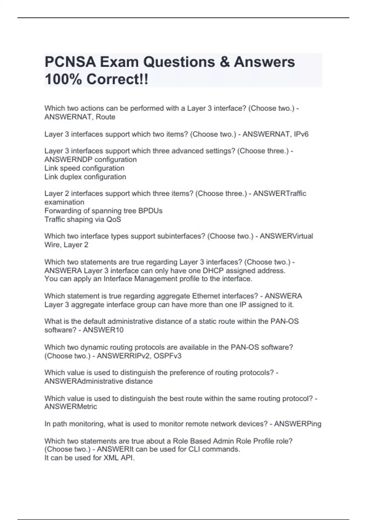 Which two actions can be performed with a Layer 3 interface? (Choose two.) - ANSWERNAT, Route Layer 3 interfaces support which two items? (Choose two.) - ANSWERNAT, IPv6 Layer 3 interfaces support which three advanced settings? (Choose three.) - ANSWERNDP configuration Link speed configuration Link duplex configuration Layer 2 interfaces support which three items? (Choose three.) - ANSWERTraffic examination Forwarding of spanning tree BPDUs Traffic shaping via QoS Which two interface types support subinterfaces? (Choose two.) - ANSWERVirtual Wire, Layer 2 Which two statements are true regarding Layer 3 interfaces? (Choose two.) - ANSWERA Layer 3 interface can only have one DHCP assigned address. You can apply an Interface Management profile to the interface. Which statement is true regarding aggregate Ethernet interfaces? - ANSWERA Layer 3 aggregate interface group can have more than one IP assigned to it. What is the default administrative distance of a static route within the PAN-OS software? - ANSWER10 Which two dynamic routing protocols are available in the PAN-OS software? (Choose two.) - ANSWERRIPv2, OSPFv3 Which value is used to distinguish the preference of routing protocols? - ANSWERAdministrative distance Which value is used to distinguish the best route within the same routing protocol? - A