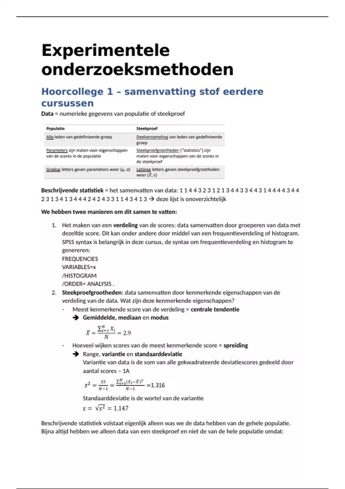 1) Hypothesetoetsen: bij hypothese toetsen ga je na of het gemiddelde in de populatie gelijk is aan