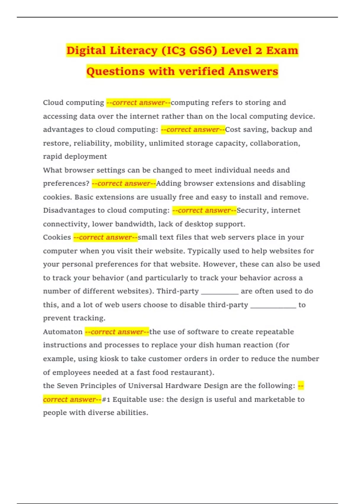 Digital Literacy (IC3 GS6) Level 2 Exam Questions with verified Answers Cloud computing --correct answer--computing refers to storing and accessing data over the internet rather than on the local computing device. advantages to cloud computing: --correct answer--Cost saving, backup and restore, reliability, mobility, unlimited storage capacity, collaboration, rapid deployment What browser settings can be changed to meet individual needs and preferences? --correct answer--Adding browser extensions and disabling cookies. Basic extensions are usually free and easy to install and remove.