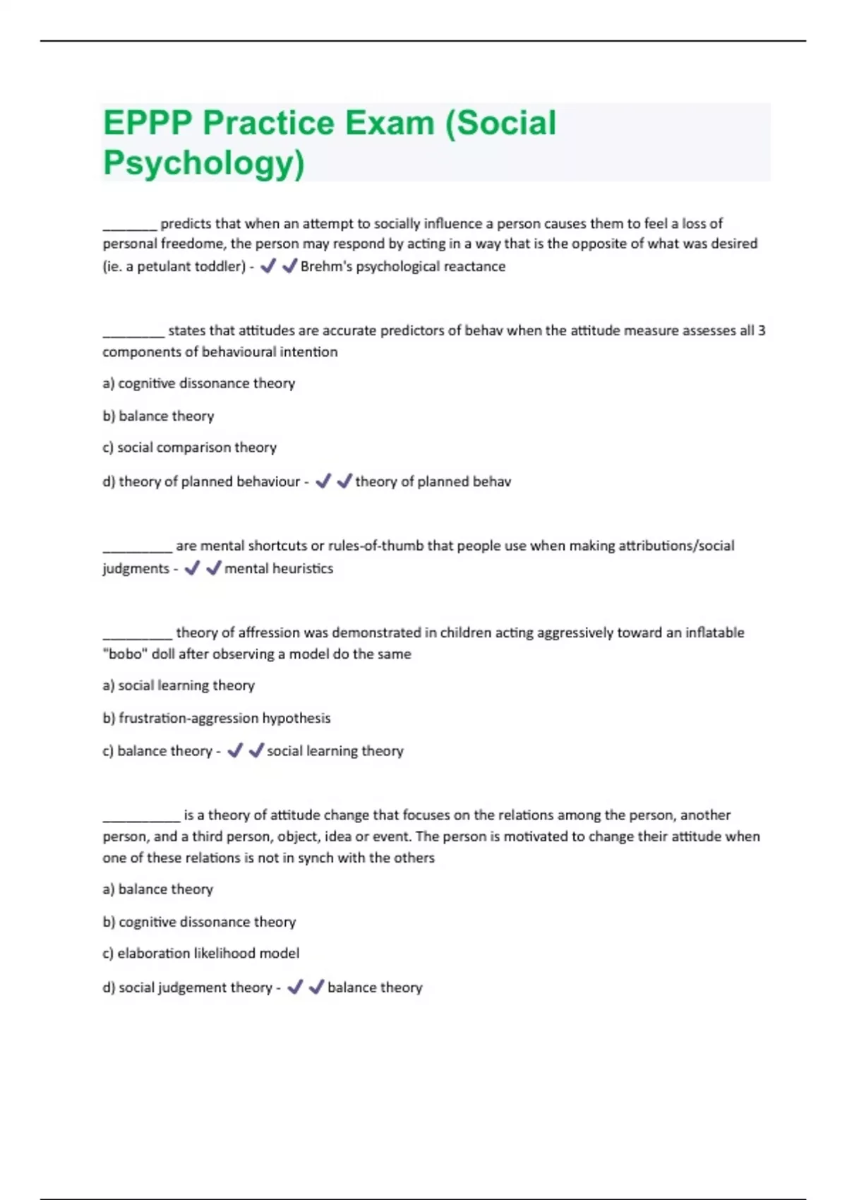 _______ predicts that when an attempt to socially influence a person causes them to feel a loss of personal freedome, the person may respond by acting in a way that is the opposite of what was desired (ie. a petulant toddler) - Brehm's psychological reactance ________ states that attitudes are accurate predictors of behav when the attitude measure assesses all 3 components of behavioural intention a) cognitive dissonance theory b) balance theory c) social comparison theory d) theory of planned behaviour - theory of planned behav _________ are mental shortcuts or rules-of-thumb that people use when making attributions/social judgments - mental heuristics _________ theory of affression was demonstrated in children acting aggressively toward an inflatable "bobo" doll after observing a model do the same a) social learning theory b) frustration-aggression hypothesis c) balance theory - social learning theory __________ is a theory of attitude change that focuses on the relations among the person, another person, and a third person, object, idea or event. The person is motivated to change their attitude when one of these relations is not in synch with the others a) balance theory b) cognitive dissonance theory c) elaboration likelihood model d) social judgement theory - balance theory__________ is a theory of attitude change that predicts that persuasion can occur either through the central or peripheral routes a) balance theory b) cognitive dissonance theory c) elaboration likelihood model d) social judgement theory - elaboration likelihood model`