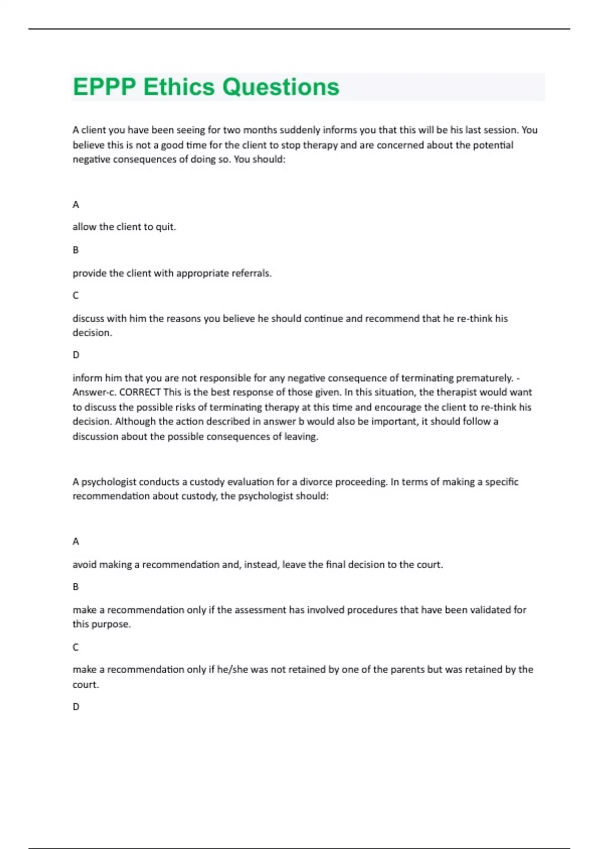 A client you have been seeing for two months suddenly informs you that this will be his last session. You believe this is not a good time for the client to stop therapy and are concerned about the potential negative consequences of doing so. You should: A allow the client to quit. B provide the client with appropriate referrals. C discuss with him the reasons you believe he should continue and recommend that he re-think his decision. D inform him that you are not responsible for any negative consequence of terminating prematurely. - Answer-c. CORRECT This is the best response of those given. In this situation, the therapist would want to discuss the possible risks of terminating therapy at this time and encourage the client to re-think his decision. Although the action described in answer b would also be important, it should follow a discussion about the possible consequences of leaving. A psychologist conducts a custody evaluation for a divorce proceeding. In terms of making a specific recommendation about custody, the psychologist should: A avoid making a recommendation and, instead, leave the final decision to the court. B make a recommendation only if the assessment has involved procedures that have been validated for this purpose. C make a recommendation only if he/she was not retained by one of the parents but was retained by the court. Dmake a recommendation only if it is based on adequate psychological data and consideration of the best interests of the child. -Answer-d. CORRECT This is the closest to the provisions of APA's Guidelines for Child Custody Evaluations in Family Law Proceedings. There are no prohibitions against making recommendations in custody situations. However, a psychologist must always be very careful about recommendations that may have an important impact on the lives of others. A psychologist is hired by a defense attorney to evaluate a defendant to determine the appropriateness of the insanity defense. During the first meeting with the defendant, the psychologist explains the purpose of the evaluation. The defendant says he doesn't want to cooperate with the evaluation because of the limits on confidentiality. The psychologist should: A obtain a court order before evaluating the defendant. B obtain as much information from the defendant as possible and explain to the court why the evaluation is not complete. C explain to the defendant that privilege is waived in this situation and that the evaluation is in his best interests. D postpone the evaluation and notify the defense attorney of the defendant's concerns. -Answer-d. CORRECT This response is most consistent with "common sense" and with the provisions of Paragraph 6.03.01 of the Specialty Guidelines. A psychologist is working in the employee assistance program (EAP) of a large corporation. She is approached by a supervisor who referred an employee to the EAP several weeks ago when the employee was having problems at home that began interfering with her job performance. The employer now wants to know if the employee has been receiving counseling from the psychologist and, if so, how the sessions are going. In fact, the employee has seen the psychologist four times and has another session scheduled for the next week. The psychologist should: Ainform the supervisor that she has seen the employee but provide no information about the employee's treatment. B inform the supervisor that she has seen the employee and provide a summary of the employee's progress with regard to the reason for the referral. C remind the supervisor of the need to maintain confidentiality and provide him with no information about the emp -Answer-c. CORRECT The confidentiality of clients of EAPs may be breached only in legally defined situations - e.g., when the client signs a release or is believed to be a danger to him/herself or others. Therefore, the psychologist would not even want to say anything that indicates whether or not she is seeing the employee (answer d). A therapist has been seeing a couple for several weeks. Although they seem reluctant to bring in their 13 year old daughter, the therapist finally convinces them that the problems they have been experiencing seem to be related to their daughter and that it would be good to include her in therapy sessions. It soon becomes clear that the girl has been sexually abused by her father. When the therapist confronts the man about this, he admits that he molested his daughter on two occasions but says that he has not done so in over a year. The girl confirms that this is true. The parents plead with the therapist not to make a report to the authorities and promise that they will continue in treatment to make sure that the father doesn't sexually abuse the girl again. The therapist decides to comply with the wishes of the parents since the abuse occurred in the past and the family is apparently committed to obtaining psycholog - Answer-c. CORRECT The psychologist's failure to make a child abuse report in this situation violates ethical and legal requirements. A woman calls you asking for information about her son who is a current client of yours. You have been seeing the son in individual therapy since he was 17. He is now 18-1/2 and has just started college. This mother is paying for her son's therapy. You should: A provide the woman with the information she has requested about her son. B provide the woman only with information that is relevant to the purpose of her request. C provide the woman only with that part of the record that pertains to her son before he turned 18. Dprovide the woman with information only with the permission of her son. -Answer-D provide the woman with information only with the permission of her son. d. CORRECT Since the son has reached the age of majority, his mother's right to access to his records has ceased, and his permission is required to provide her with any information from his records. According to the APA's General Guidelines for Providers of