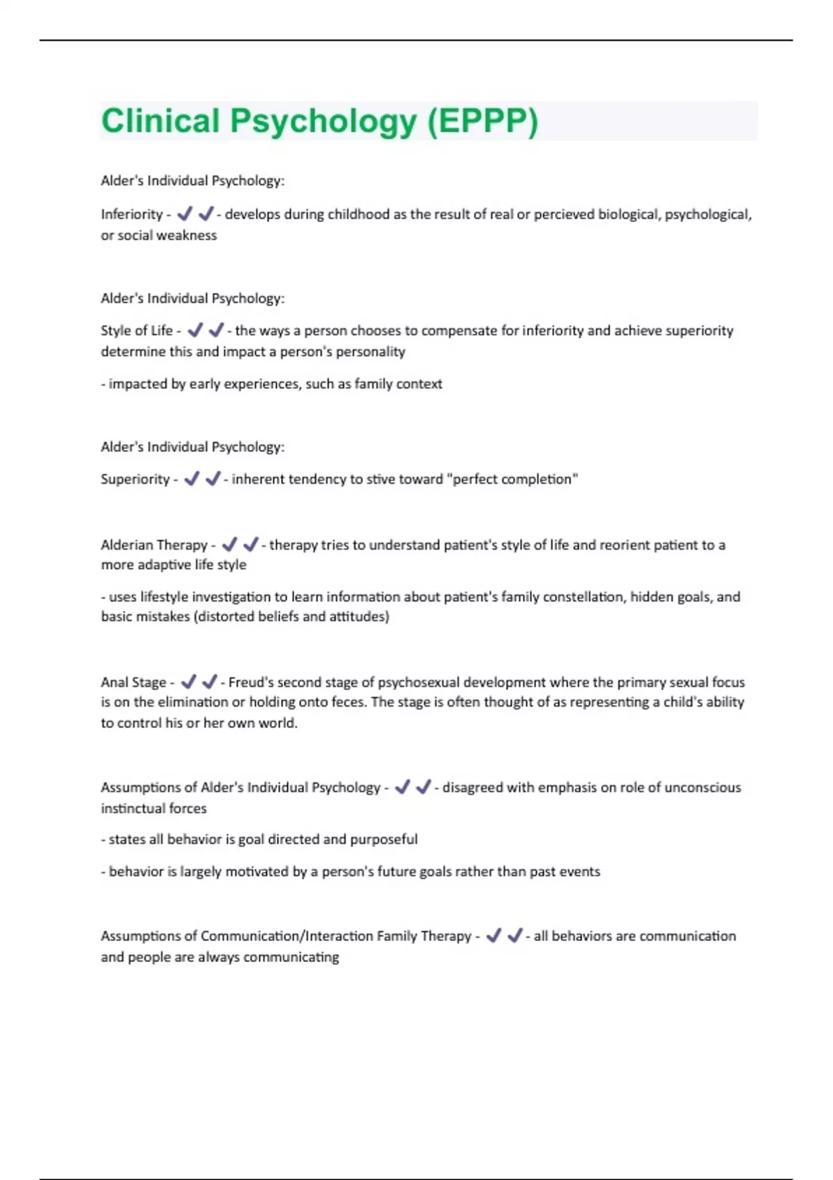 Alder's Individual Psychology: Inferiority - - develops during childhood as the result of real or percieved biological, psychological, or social weakness Alder's Individual Psychology: Style of Life - - the ways a person chooses to compensate for inferiority and achieve superiority determine this and impact a person's personality - impacted by early experiences, such as family context Alder's Individual Psychology: Superiority - - inherent tendency to stive toward "perfect completion" Alderian Therapy - - therapy tries to understand patient's style of life and reorient patient to a more adaptive life style - uses lifestyle investigation to learn information about patient's family constellation, hidden goals, and basic mistakes (distorted beliefs and attitudes) Anal Stage - - Freud's second stage of psychosexual development where the primary sexual focus is on the elimination or holding onto feces. The stage is often thought of as representing a child's ability to control his or her own world. Assumptions of Alder's Individual Psychology - - disagreed with emphasis on role of unconscious instinctual forces - states all behavior is goal directed and purposeful - behavior is largely motivated by a person's future goals rather than past events Assumptions of Communication/Interaction Family Therapy - - all behaviors are communication and people are always communicating- communication has a report function (informational) and a command function (makes a statement about the relationship between communicators) - problems arise when these are contradictory - communications patterns are either symmetrical or complementary Assumptions of Existential Therapies (e.g., Logotherapy) - - emphasize the human conditions of depersonalization, loneliness, and isolation - people are not static, but are in a constant state of becoming Assumptions of Extended Family Systems Therapy (Bowen) - - extends general systems theory beyond the nuclear family Assumptions of Gestalt Therapy (Fritz Perls) - - based on premise that each person is capable of assuming personal responsibility for his own thoughts, feelings, and actions and living as an integrated whole - people temd to seek closure - a person's perceptions of parts as wholes reflect his current needs - a person's behavior represents a world that is greater than the sum of its parts - behavior can be fully understood only in its context - a person experiences the world in accord with the principle of figure/ground Assumptions of Humanistic Psychotherapies - - to understand a person, one must understand her subjective experience - focus on current behaviors - there is inherent potential for self-determination and self-actualization - therapy involves an authentic, collaborative, and egalitarian relationship between therapist and client - diagnostic labels are unhelpful Assumptions of Interpersonal Therapy(Klerman) - - primary focus is on social relationships although it recognizes the contributions of early experience, biological predisposition, and personality - originally developed to treat depression - combines psychodynamic and CBT therapies Assumptions of Jung's Analytical Psychotherapy - - behavior is determined not only by past events but also by future goals and aspirations - personality is the consequence of both conscious and unconscious factors - personality consists of two attitudes (extraversion and introversion) and four psychological functions (thinking, feeling, sensing, and intuiting) - personality develops throughout life