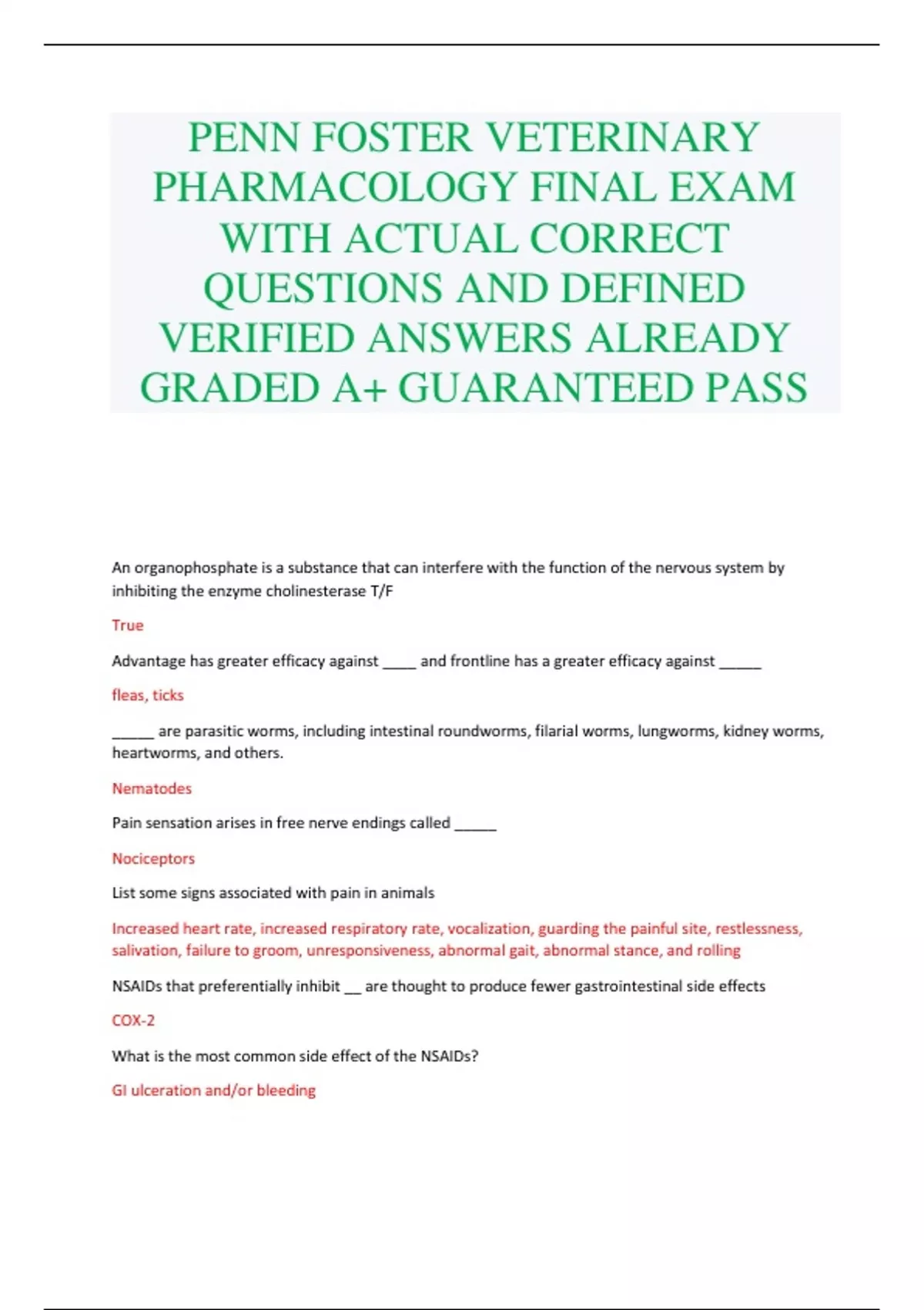 PENN FOSTER VETERINARY PHARMACOLOGY FINAL EXAM WITH ACTUAL CORRECT QUESTIONS AND DEFINED VERIFIED ANSWERS ALREADY GRADED A+ GUARANTEED PASS