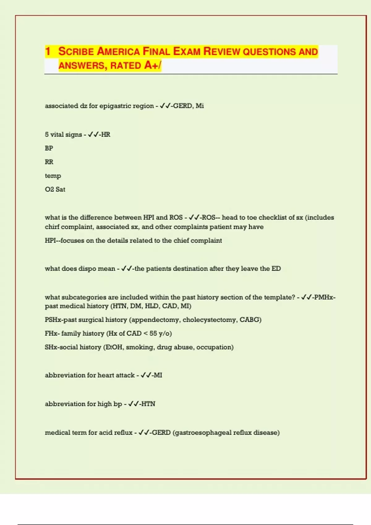 SCRIBE AMERICA FINAL EXAM REVIEW QUESTIONS AND ANSWERS, RATED A+/ associated dz for epigastric region - -GERD, Mi 5 vital signs - -HR BP RR temp O2 Sat what is the difference between HPI and ROS - -ROS-- head to toe checklist of sx (includes chirf complaint, associated sx, and other complaints patient may have HPI--focuses on the details related to the chief complaint what does dispo mean - -the patients destination after they leave the ED what subcategories are included within the past history section of the template? - -PMHxpast medical history (HTN, DM, HLD, CAD, MI) PSHx-past surgical history (appendectomy, cholecystectomy, CABG) FHx- family history (Hx of CAD < 55 y/o) SHx-social history (EtOH, smoking, drug abuse, occupation) abbreviation for heart attack - -MI abbreviation for high bp - -HTN medical term for acid reflux - -GERD (gastroesophageal reflux disease) medical term for stroke - -Cerebrovascular accident (CVA) gallbladder removal - -cholecystectomy nkda - -no known drug allergies medical term for redness - -erythema medial term for bruising - -ecchymosis if the doctor says the exam was benign, what does that mean - -normal-- nothing of concern PE diagnosed by - -CTA chest (CT chest with IV contrast) PTX diagnosed by - -CXR PNA diagnosed by - -CXR COPD diagnosed by - -CXR with Hx of smoking Asthma diagnosed - -clinically Hemorrhagic CVA (imp things to document) - -tPA ineligibility Ischemic CVA (imp things to doc) - -tpa eligilibility last known normal meningitis (imp things to doc) - -HA Fever neck pain spinal cord injury (imp things to doc) - -bilateral extremity weakness TIA (imp things to doc) - -when did sx resolve? Seizure (imp things to doc) - -postictal state, missed sz meds