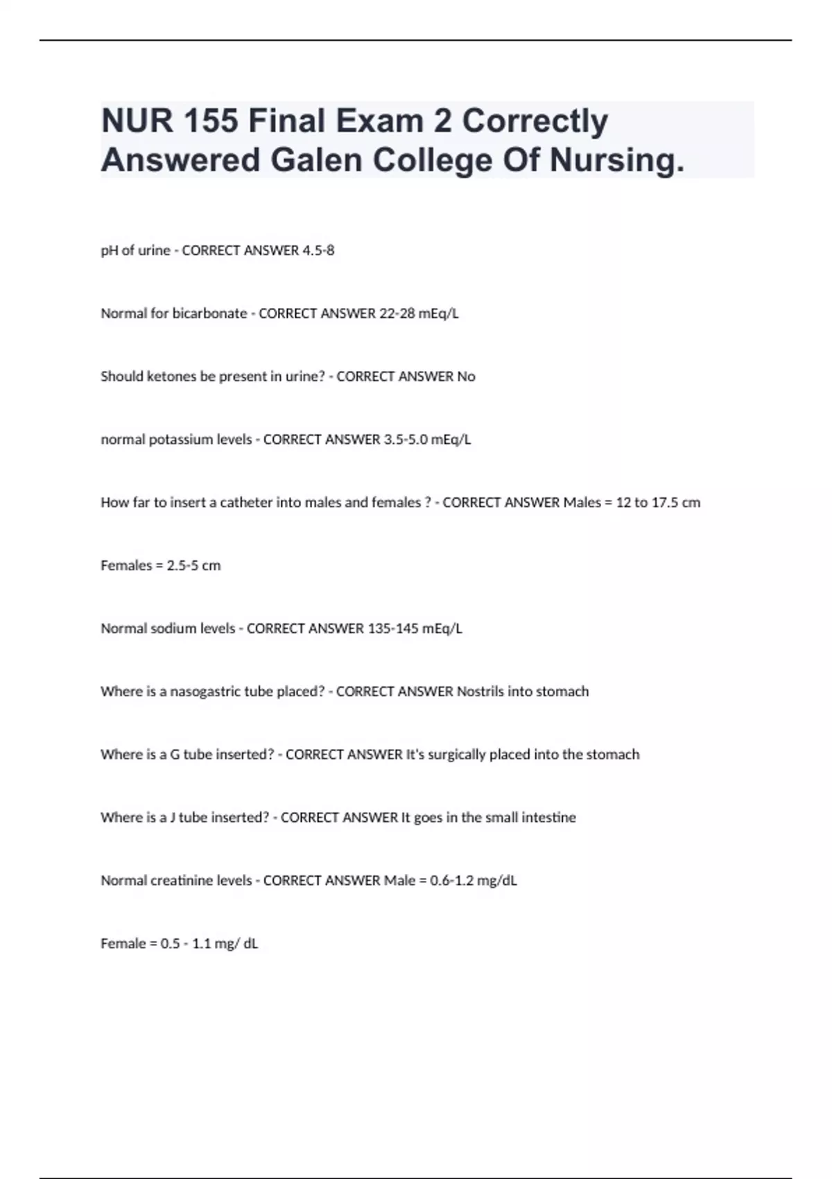 NUR 155 Final Exam 2 Correctly Answered Galen College Of Nursing. pH of urine - CORRECT ANSWER 4.5-8 Normal for bicarbonate - CORRECT ANSWER 22-28 mEq/L Should ketones be present in urine? - CORRECT ANSWER No normal potassium levels - CORRECT ANSWER 3.5-5.0 mEq/L How far to insert a catheter into males and females ? - CORRECT ANSWER Males = 12 to 17.5 cm Females = 2.5-5 cm Normal sodium levels - CORRECT ANSWER 135-145 mEq/L Where is a nasogastric tube placed? - CORRECT ANSWER Nostrils into stomach