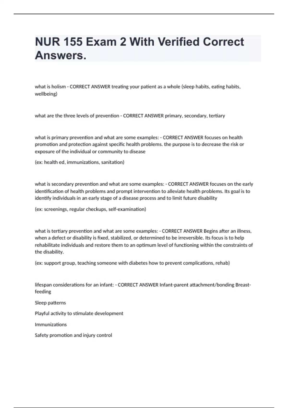 NUR 155 Exam 2 With Verified Correct Answers. what is holism - CORRECT ANSWER treating your patient as a whole (sleep habits, eating habits, wellbeing) what are the three levels of prevention - CORRECT ANSWER primary, secondary, tertiary what is primary prevention and what are some examples: - CORRECT ANSWER focuses on health promotion and protection against specific health problems. the purpose is to decrease the risk or exposure of the individual or community to disease (ex: health ed, immunizations, sanitation) what is secondary prevention and what are some examples: - CORRECT ANSWER focuses on the early identification of health problems and prompt intervention to alleviate health problems. Its goal is to identify individuals in an early stage of a disease process and to limit future disability (ex: screenings, regular checkups, self-examination) what is tertiary prevention and what are some examples: - CORRECT ANSWER Begins after an illness, when a defect or disability is fixed, stabilized, or determined to be irreversible. Its focus is to help rehabilitate individuals and restore them to an optimum level of functioning within the constraints of the disability. (ex: support group, teaching someone with diabetes how to prevent complications, rehab) lifespan considerations for an infant: - CORRECT ANSWER Infant-parent attachment/bonding Breast-feeding Sleep patterns Playful activity to stimulate development Immunizations Safety promotion and injury control lifespan considerations for children: - CORRECT ANSWER Nutrition Dental checkups Rest and exercise Immunizations Safety promotion and injury control lifespan considerations for adolescents: - CORRECT ANSWER Communicating with the teen Hormonal changes Nutrition Exercise and rest Peer group influences Self-concept and body image Sexuality Safety promotion and accident prevention lifespan considerations for older adults: - CORRECT ANSWER Adequate sleep Appropriate use of alcohol Dental/oral health Drug management Exercise Foot health Health screening recommendations Hearing aid use Immunizations Medication instruction Mental health Nutrition Physical fitness Preventive health services