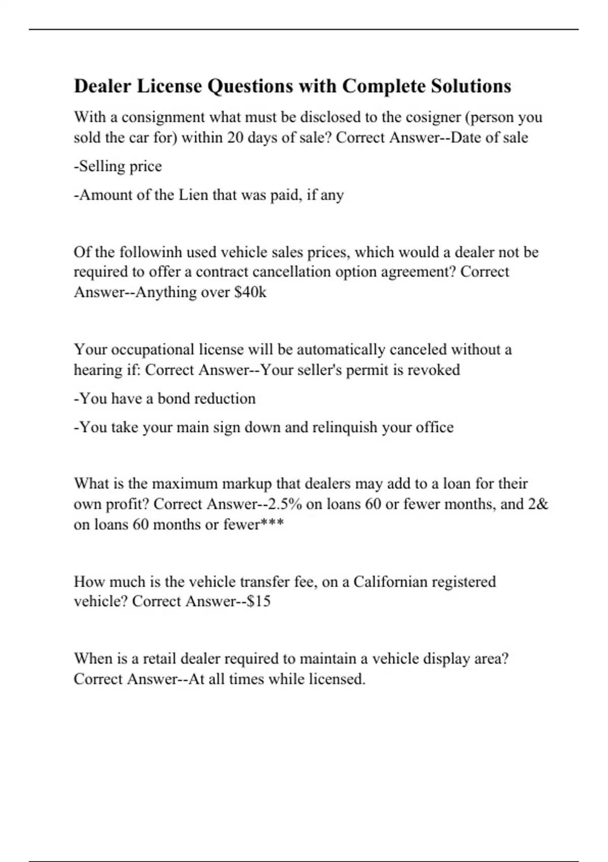 Dealer License Questions with Complete Solutions