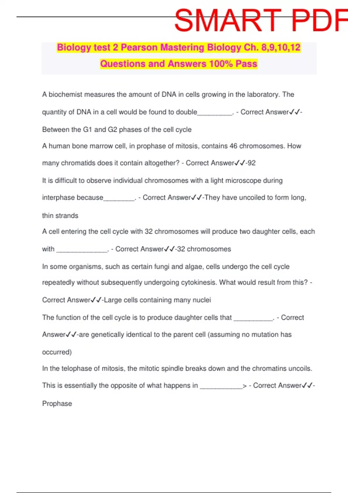 Biology test 2 Pearson Mastering Biology Ch. 8,9,10,12 Questions and Answers 100% Pass A biochemist measures the amount of DNA in cells growing in the laboratory. The quantity of DNA in a cell would be found to double_________. - Correct Answer️️ - Between the G1 and G2 phases of the cell cycle A human bone marrow cell, in prophase of mitosis, contains 46 chromosomes. How many chromatids does it contain altogether? - Correct Answer️️ -92 It is difficult to observe individual chromosomes with a light microscope during interphase because________. - Correct Answer️️ -They have uncoiled to form long, thin strands A cell entering the cell cycle with 32 chromosomes will produce two daughter cells, each with _____________. - Correct Answer️️ -32 chromosomes In some organisms, such as certain fungi and algae, cells undergo the cell cycle repeatedly without subsequently undergoing cytokinesis. What would result from this? - Correct Answer️️ -Large cells containing many nuclei The function of the cell cycle is to produce daughter cells that __________. - Correct Answer️️ -are genetically identical to the parent cell (assuming no mutation has occurred) In the telophase of mitosis, the mitotic spindle breaks down and the chromatins uncoils. This is essentially the opposite of what happens in ___________> - Correct Answer️️ - ProphaseSMART PDF You would recognize a dividing cell as a plant cell and not an animal cell if you saw that it had __________. - Correct Answer️️ -Formed a cell plate Cytochalasin B is a chemical that disrupts microfilament formation. This chemical would interfere with ________. - Correct Answer️️ -Cleavage What is the difference between a benign tumor and a malignant tumor? - Correct Answer️️ -Benign tumors do not metastasize; malignant tumors do. In humans, the _______ determines the sex of the offspring because ______________. - Correct Answer️️ -male... the male can contribute either an X or a Y chromosome, whereas the female can contribute on an X What is the normal result of a diploid cell undergoing meiosis? - Correct Answer️️ - Four haploid cells Mitosis and cytokinesis result in the formation of ___________; meiosis and cytokinesis result in the formation of _____________. - Correct Answer️️ -two diploids cells... Four haploid cells If the diploid member of chromosomes in a certain animal is 6 (2n=6), there are three sets of two homologous chromosomes each, or three Pais. How do these three pairs align and separate in meiosis? - Correct Answer️️ -They align and assort independently to form any of eight different combinations. The major contribution of sex to evolution has been_______> - Correct Answer️️ -to provide a method permitting the inheritance of somatic mutationsSMART PDF Prior to some recent studies, such as with bdelloid rotifers, scientists thought that organisms that reproduced solely by asexual reproduction were __________. - Correct Answer️️ -dead ends Which one of the following occurs in meiosis, but not in mitosis? - Correct Answer️️ - pairing of homologous chromosomes Both asexual and sexual reproduction rely on ___________. - Correct Answer️️ -cell division Which of the following statements describes a major difference between meiosis II and mitosis in a diploid animals? - Correct Answer️️ -Meiosis II occurs in