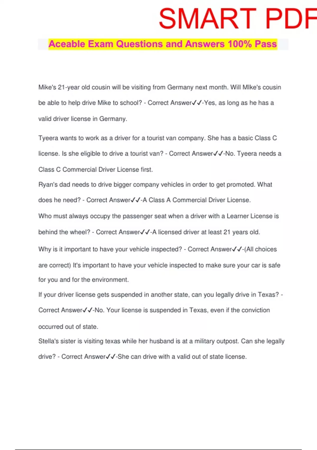Aceable Exam Questions and Answers 100% Pass Mike's 21-year old cousin will be visiting from Germany next month. Will MIke's cousin be able to help drive Mike to school? - Correct Answer️️ -Yes, as long as he has a valid driver license in Germany. Tyeera wants to work as a driver for a tourist van company. She has a basic Class C license. Is she eligible to drive a tourist van? - Correct Answer️️ -No. Tyeera needs a Class C Commercial Driver License first. Ryan's dad needs to drive bigger company vehicles in order to get promoted. What does he need? - Correct Answer️️ -A Class A Commercial Driver License. Who must always occupy the passenger seat when a driver with a Learner License is behind the wheel? - Correct Answer️️ -A licensed driver at least 21 years old. Why is it important to have your vehicle inspected? - Correct Answer️️ -(All choices are correct) It's important to have your vehicle inspected to make sure your car is safe for you and for the environment. If your driver license gets suspended in another state, can you legally drive in Texas? - Correct Answer️️ -No. Your license is suspended in Texas, even if the conviction occurred out of state. Stella's sister is visiting texas while her husband is at a military outpost. Can she legally drive? - Correct Answer️️ -She can drive with a valid out of state license.SMART PDF A person's regular Class C driver license allows them to legally drive a motorcycle. - Correct Answer️️ -False. (Class M) Pete's mother is ill and nobody else can take his little sister to school. He has a Learner License and is 17. What can he do? - Correct Answer️️ -Apply for a Minor Restricted Driver License. You license may get suspended if ____ within a 12-month period. - Correct Answer️️ - you have 4 or more traffic convictions within a 12-month period. Turnabouts and railroad crossing are examples of _____ . - Correct Answer️️ -non- traditional intersection While driving, you see a school bus in the opposite lane dropping off students. There is no median. When is it ok to go? - Correct Answer️️ -You can go once the red lights turn off and the bus moves again. If an emergency vehicle is moving in your lane with its lights on, you must ____ . - Correct Answer️️ -move a lane over or slow down. Riley is riding his motorcycle on a a road that ends in a cross street. What should he do at the T-intersection? - Correct Answer️️ -Riley needs to yield the right of way to the vehicles on the cross street. You and another driver reach a busy intersection at the same time. What's the safest course of action? - Correct Answer️️ -Yield the right of way to the other driver. There are no legal consequences for ignoring right-of-way procedures. - Correct Answer️️ -FalseSMART PDF You are on a divided highway with a raised median when you see a school bus stopped on the other side of the road. Are you legally required to stop? - Correct Answer️️ -No, because the oncoming traffic is separated by a raised median. Drivers should always give pedestrians the right of way. - Correct Answer️️ -True. You're driving on an unpaved road that leads to a highway. What should you do when you reach the highway? - Correct Answer️️ -Yield to vehicles on t