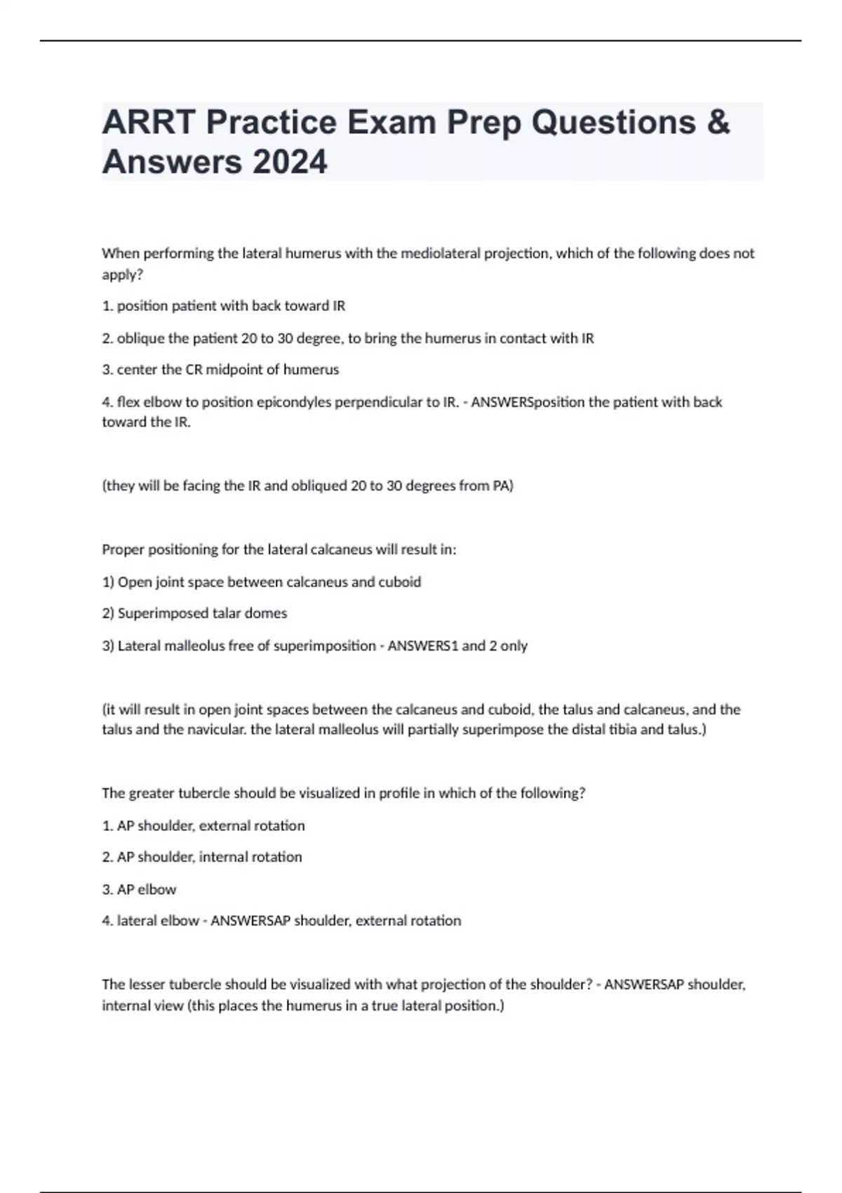 ARRT Practice Exam Prep Questions & Answers 2024 When performing the lateral humerus with the mediolateral projection, which of the following does not apply? 1. position patient with back toward IR 2. oblique the patient 20 to 30 degree, to bring the humerus in contact with IR 3. center the CR midpoint of humerus 4. flex elbow to position epicondyles perpendicular to IR. - ANSWERSposition the patient with back toward the IR. (they will be facing the IR and obliqued 20 to 30 degrees from PA) Proper positioning for the lateral calcaneus will result in: 1) Open joint space between calcaneus and cuboid 2) Superimposed talar domes 3) Lateral malleolus free of superimposition - ANSWERS1 and 2 only (it will result in open joint spaces between the calcaneus and cuboid, the talus and calcaneus, and the talus and the navicular. the lateral malleolus will partially superimpose the distal tibia and talus.) The greater tubercle should be visualized in profile in which of the following? 1. AP shoulder, external rotation 2. AP shoulder, internal rotation 3. AP elbow 4. lateral elbow - ANSWERSAP shoulder, external rotation The lesser tubercle should be visualized with what projection of the shoulder? - ANSWERSAP shoulder, internal view (this places the humerus in a true lateral position.)