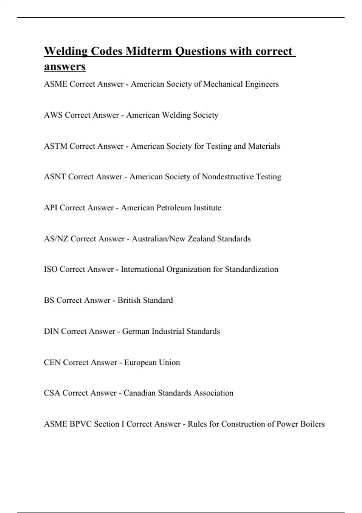 ASME Correct Answer - American Society of Mechanical Engineers AWS Correct Answer - American Welding Society ASTM Correct Answer - American Society for Testing and Materials ASNT Correct Answer - American Society of Nondestructive Testing API Correct Answer - American Petroleum Institute AS/NZ Correct Answer - Australian/New Zealand Standards ISO Correct Answer - International Organization for Standardization BS Correct Answer - British Standard DIN Correct Answer - German Industrial Standards CEN Correct Answer - European Union CSA Correct Answer - Canadian Standards Association ASME BPVC Section I Correct Answer - Rules for Construction of Power Boilers