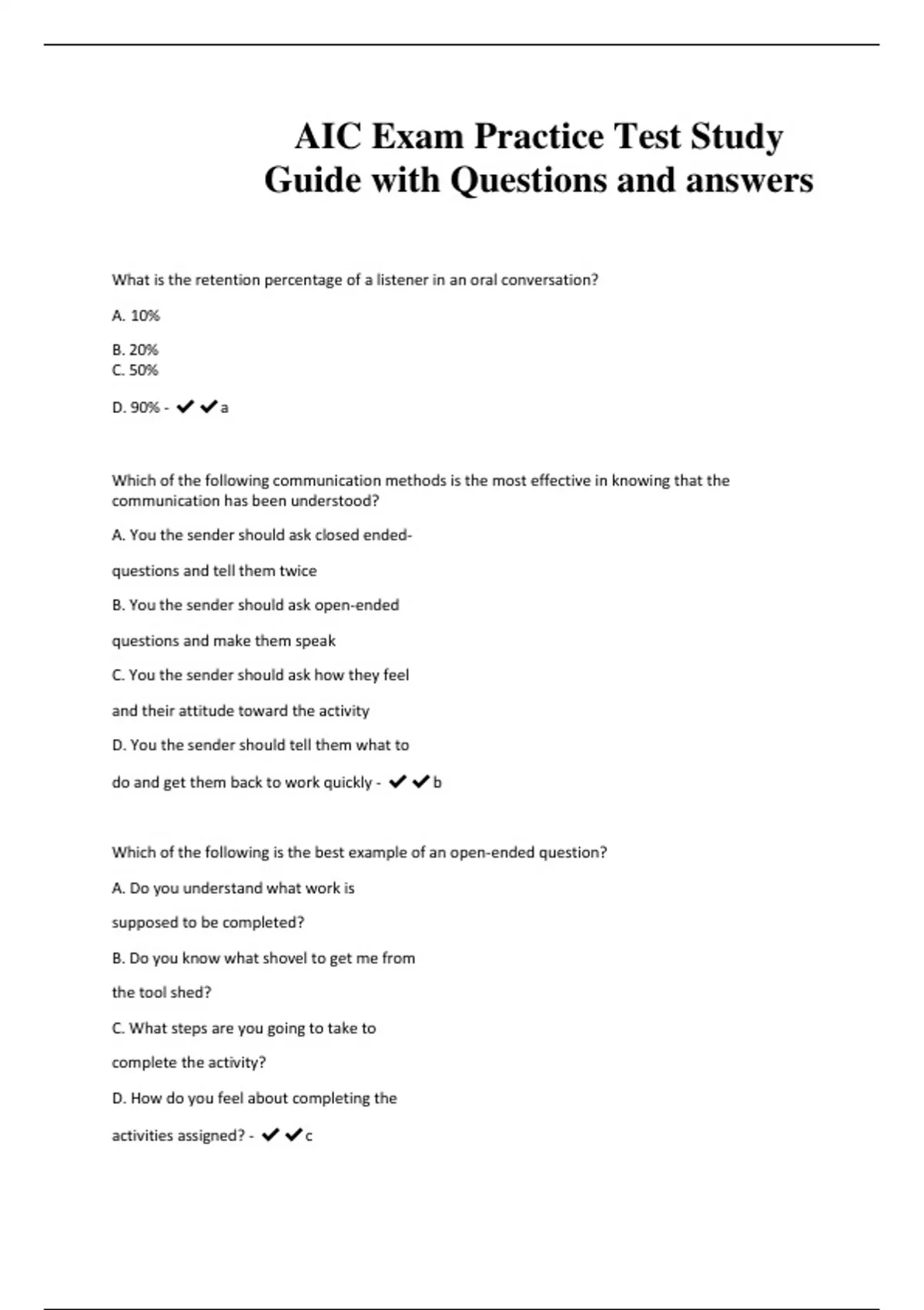 What is the retention percentage of a listener in an oral conversation? A. 10% B. 20% C. 50% D. 90% - a Which of the following communication methods is the most effective in knowing that the communication has been understood? A. You the sender should ask closed ended- questions and tell them twice B. You the sender should ask open-ended questions and make them speak C. You the sender should ask how they feel and their attitude toward the activity D. You the sender should tell them what to do and get them back to work quickly - b