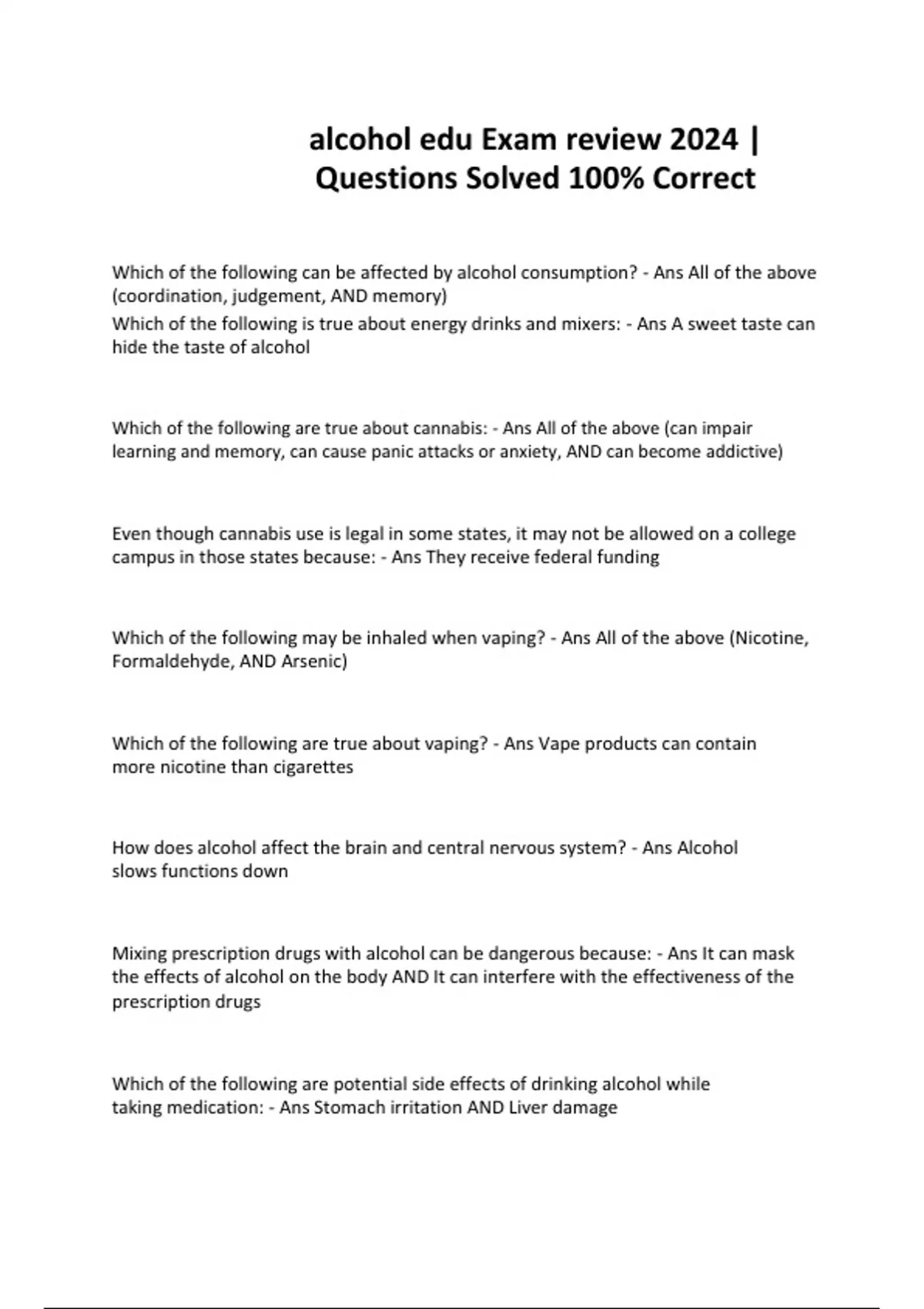 alcohol edu Exam review 2024 | Questions Solved 100% Correct