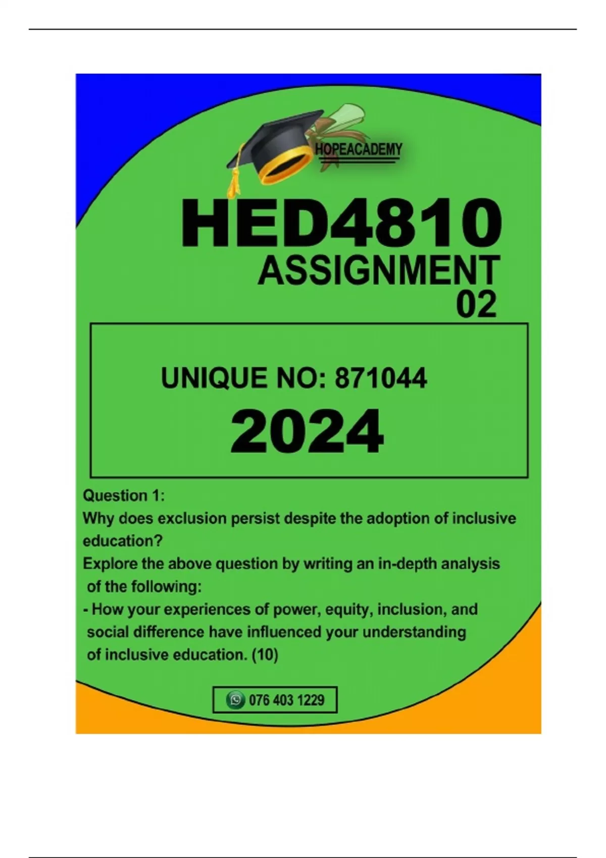 HED4810 ASSIGNMENT 02 Unique No: 871044 Question 1: Why does exclusion persist despite the adoption of inclusive education? Explore the above question by writing an in-depth analysis of the following: - How your experiences of power, equity, inclusion, and social difference have influenced your understanding of inclusive education. (10)