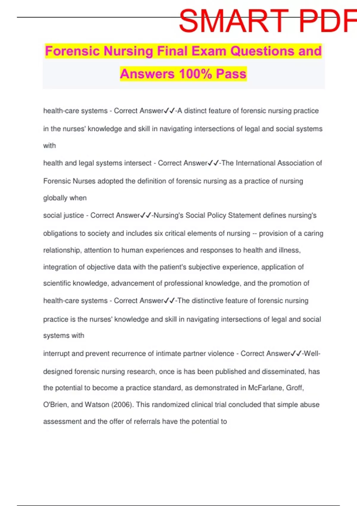 Forensic Nursing Final Exam Questions and Answers 100% Pass health-care systems - Correct Answer️️ -A distinct feature of forensic nursing practice in the nurses' knowledge and skill in navigating intersections of legal and social systems with health and legal systems intersect - Correct Answer️️ -The International Association of Forensic Nurses adopted the definition of forensic nursing as a practice of nursing globally when social justice - Correct Answer️️ -Nursing's Social Policy Statement defines nursing's obligations to society and includes six critical elements of nursing -- provision of a caring relationship, attention to human experiences and responses to health and illness, integration of objective data with the patient's subjective experience, application of scientific knowledge, advancement of professional knowledge, and the promotion of health-care systems - Correct Answer️️ -The distinctive feature of forensic nursing practice is the nurses' knowledge and skill in navigating intersections of legal and social systems with interrupt and prevent recurrence of intimate partner violence - Correct Answer️️ -Well- designed forensic nursing research, once is has been published and disseminated, has the potential to become a practice standard, as demonstrated in McFarlane, Groff, O'Brien, and Watson (2006). This randomized clinical trial concluded that simple abuse assessment and the offer of referrals have the potential toSMART PDF generalist practice - Correct Answer️️ -According to the American Nurses Association and the International Association of Forensic Nurses (2009), basic forensic nursing is a Therapeutic Jurisprudence - Correct Answer️️ -What is a legal reform theory that considers how the well-being of those in the legal system is impact by legal actions, rules, and procedures? time - Correct Answer️️ -To formulate an answerable clinical questions, Melnyk and Fineout-Overhold (2005) suggest the widely used standard PICOT format -- Population/Patient, Intervention of Interest, Comparison intervention or group, Outcome, and translation science - Correct Answer️️ -The entire process of implementing research into practice is referred to as battery - Correct Answer️️ -An intentional tort accomplished by offensive touching of another without consent is a/an libel - Correct Answer️️ -A quasi-intentional tort accomplished by a written defamatory statement is a/an Intentional tort - Correct Answer️️ -A tort is a wrongful or crooked act that injures another classified three ways. The tort that requires that the person committing the act has the requisite knowledge and will to commit the wrong is a/an being human - Correct Answer️️ -At a higher level of articulation, violation of the ethical principle of autonomy is a violation of the right ofSMART PDF different responses - Correct Answer️️ -In understanding socio-cultural factors, bias, and discrimination are uncomfortable subjects to many because they give rise to difficult conversations and accountability - Correct Answer️️ -Internalized responsibility is beneficence - Correct Answer️️ -The duty of the forensic nurse is to protect the client from harm, which is enunciated by the ethical principle of malfeasance. The duty to provide service for the good of the client is enunciated in the ethical principle of autonomy - Correct Answer️️ -The ethical principle that confers respect and self- determination on all human beings, including individuals with diminished capacity by reason or age or illness including mental, psychological, or physical disorder, unconscious or semiconscious state, or under the influence of a mind-altering substance is justice - Correct Answer️️ -The ethical principle that demands that the FN is fair in all his or her interactions and communications making certain that policies and procedures are consistently and equitably applied without selective dispensation
