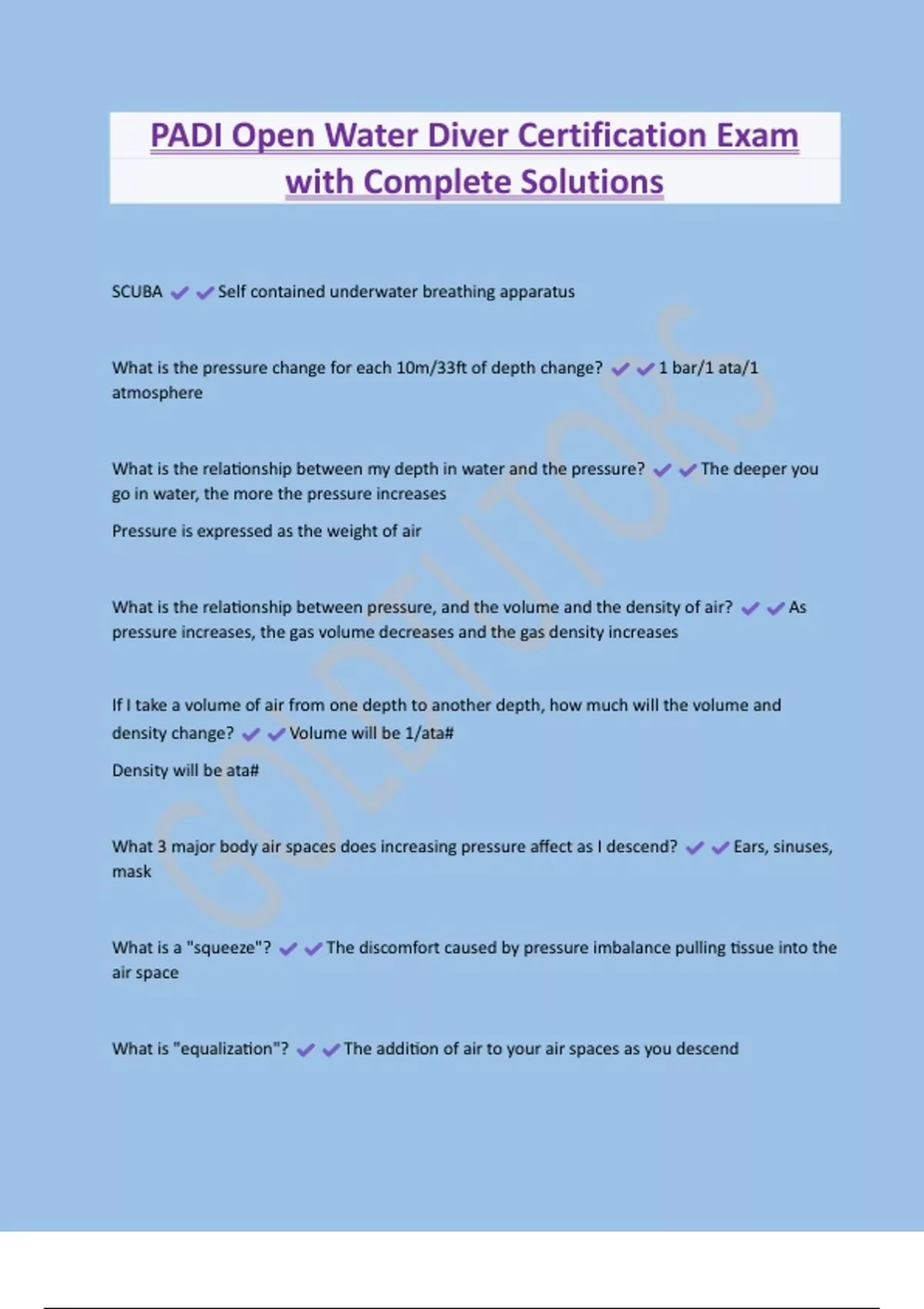 PADI Open Water Diver Certification Exam with Complete Solutions