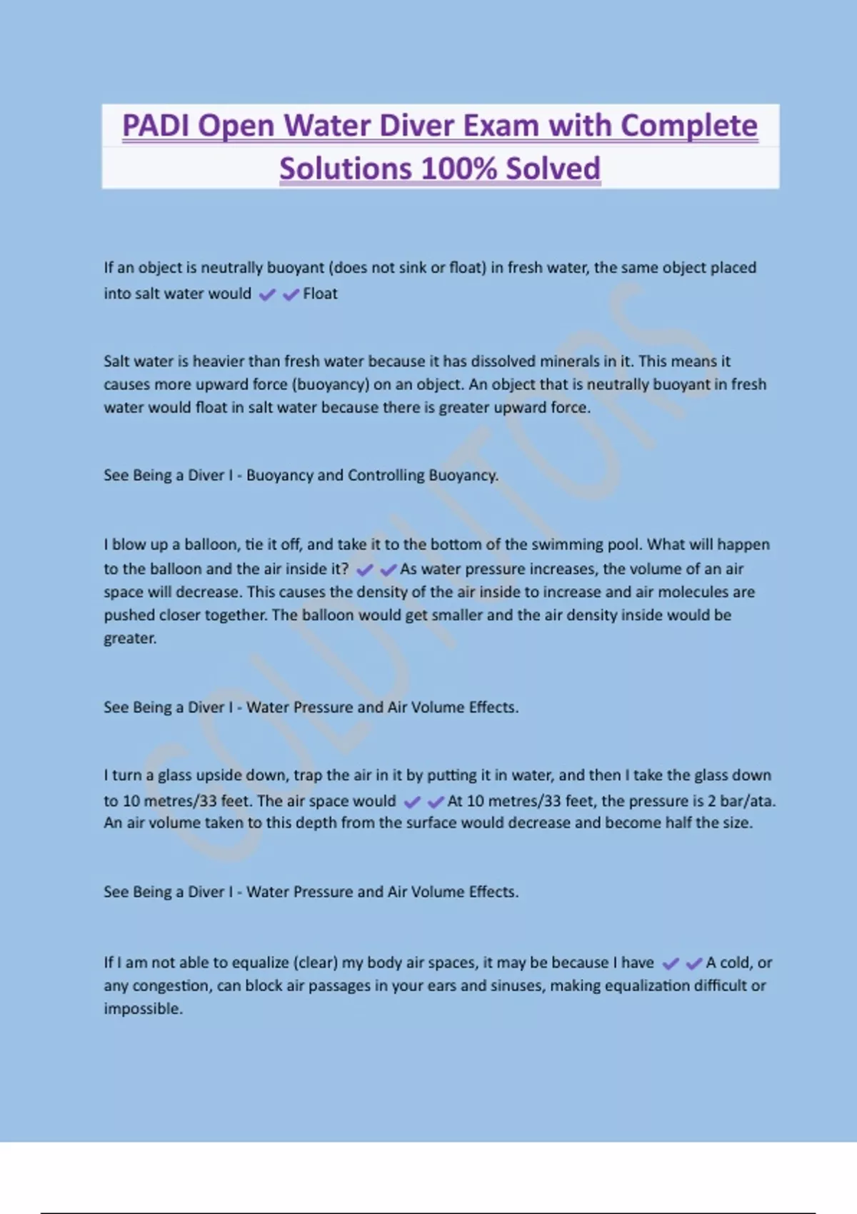 PADI Open Water Diver Exam with Complete Solutions 100% Solved If an object is neutrally buoyant (does not sink or float) in fresh water, the same object placed into salt water would Float Salt water is heavier than fresh water because it has dissolved minerals in it. This means it causes more upward force (buoyancy) on an object. An object that is neutrally buoyant in fresh water would float in salt water because there is greater upward force. See Being a Diver I - Buoyancy and Controlling Buoyancy. I blow up a balloon, tie it off, and take it to the bottom of the swimming pool. What will happen to the balloon and the air inside it? As water pressure increases, the volume of an air space will decrease. This causes the density of the air inside to increase and air molecules are pushed closer together. The balloon would get smaller and the air density inside would be