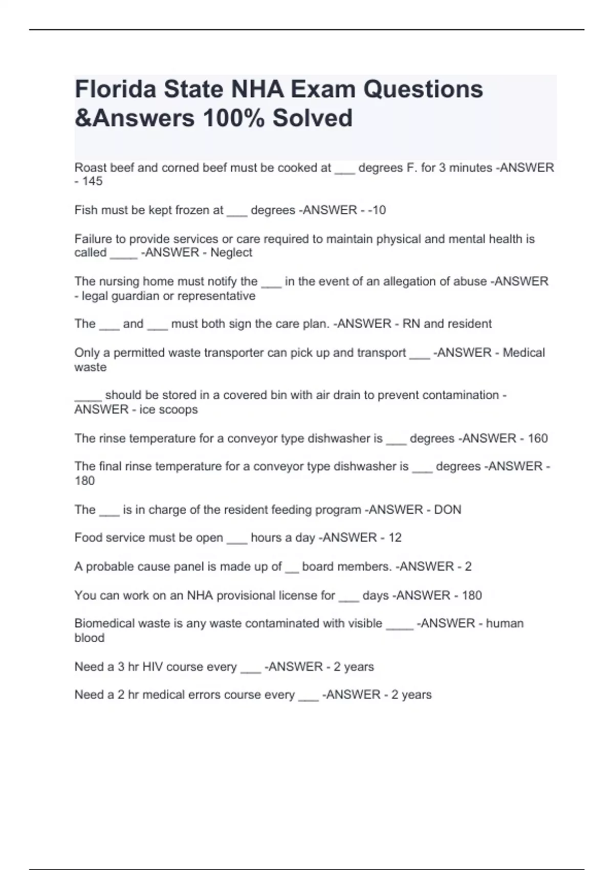 Roast beef and corned beef must be cooked at ___ degrees F. for 3 minutes -ANSWER - 145 Fish must be kept frozen at ___ degrees -ANSWER - -10 Failure to provide services or care required to maintain physical and mental health is called ____ -ANSWER - Neglect The nursing home must notify the ___ in the event of an allegation of abuse -ANSWER - legal guardian or representative The ___ and ___ must both sign the care plan. -ANSWER - RN and resident Only a permitted waste transporter can pick up and transport ___ -ANSWER - Medical waste ____ should be stored in a covered bin with air drain to prevent contamination -ANSWER - ice scoops The rinse temperature for a conveyor type dishwasher is ___ degrees -ANSWER - 160 The final rinse temperature for a conveyor type dishwasher is ___ degrees -ANSWER - 180 The ___ is in charge of the resident feeding program -ANSWER - DON Food service must be open ___ hours a day -ANSWER - 12 A probable cause panel is made up of __ board members. -ANSWER - 2 You can work on an NHA provisional license for ___ days -ANSWER - 180 Biomedical waste is any waste contaminated with vi
