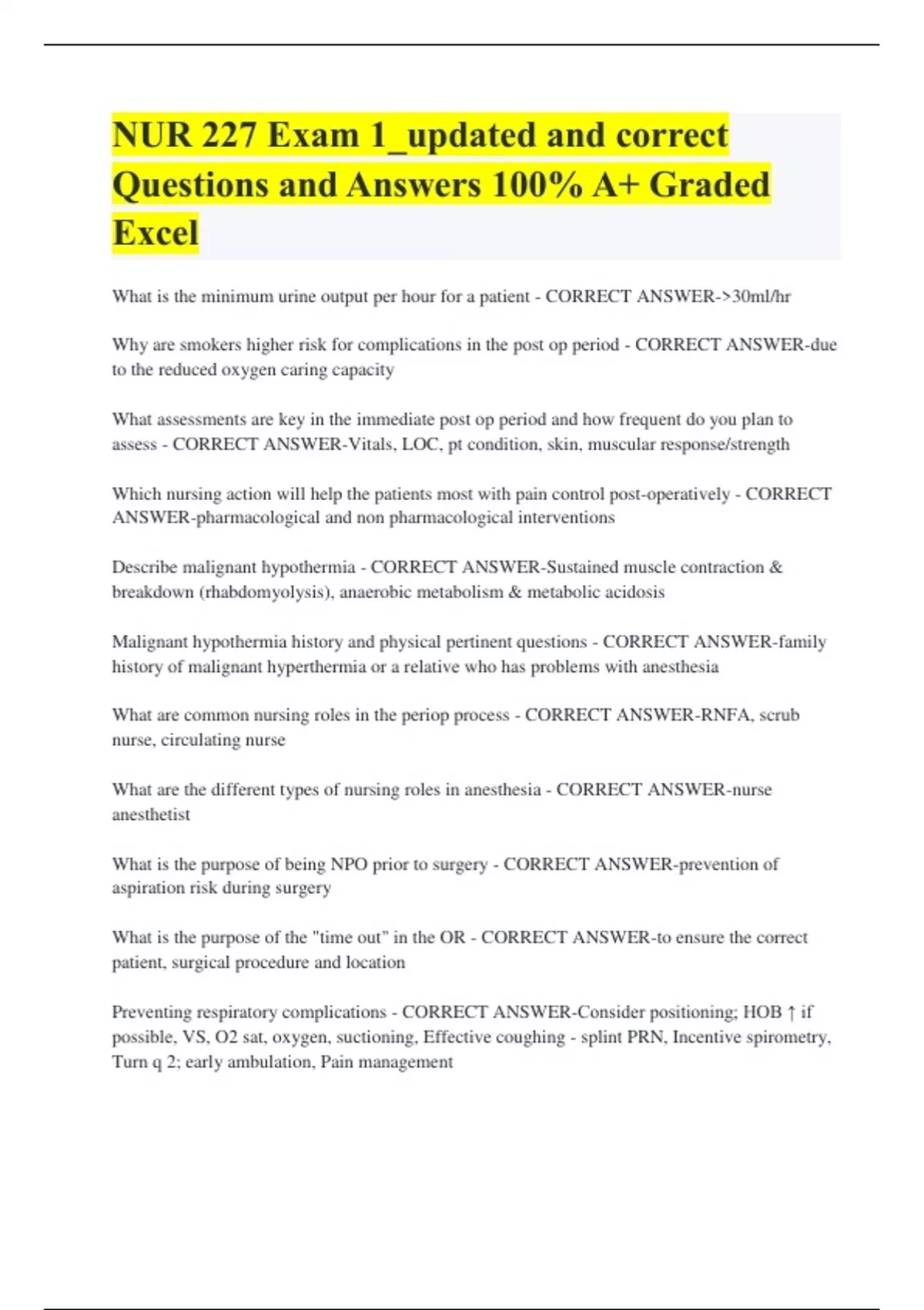 NUR 227 Exam 1_updated and correct Questions and Answers 100% A+ Graded Excel What is the minimum urine output per hour for a patient - CORRECT ANSWER->30ml/hr Why are smokers higher risk for complications in the post op period - CORRECT ANSWER-due to the reduced oxygen caring capacity What assessments are key in the immediate post op period and how frequent do you plan to assess - CORRECT ANSWER-Vitals, LOC, pt condition, skin, muscular response/strength Which nursing action will help the patients most with pain control post-operatively - CORRECT ANSWER-pharmacological and non pharmacological interventions Describe malignant hypothermia - CORRECT ANSWER-Sustained muscle contraction & breakdown (rhabdomyolysis), anaerobic metabolism & metabolic acidosis Malignant hypothermia history and physical pertinent questions - CORRECT ANSWER-family history of malignant hyperthermia or a relative who has problems with anesthesia What are common nursing roles in the periop process - CORRECT ANSWER-RNFA, scrub nurse, circulating nurse What are the different types of nursing roles in anesthesia - CORRECT ANSWER-nurse anesthetist What is the purpose of being NPO prior to surgery - CORRECT ANSWER-prevention of aspiration risk during surgery What is the purpose of the "time out" in the OR - CORRECT ANSWER-to ensure the correct patient, surgical procedure and location Preventing respiratory complications - CORRECT ANSWER-Consider positioning; HOB ↑ if possible, VS, O2 sat, oxygen, suctioning, Effective coughing - splint PRN, Incentive spirometry, Turn q 2; early ambulation, Pain management Preventing cardiac complications - CORRECT ANSWER-moniter vital signs, ambulation of patient, leg exercises, moniter wound Preventing wound complications - CORRECT ANSWER-Assess risk Monitor wound at least each shift, Protect with appropriate dressing/keep clean and dry, Infection control—aseptic tech during dressing change, Nutrition—increased CHO, proteins, calories, vitamins, hydration Preventing paralytic ileus - CORRECT ANSWER-Assess and treat nausea, Gradually advance diet, Monitor dietary intake, Ambulation, Hydration, Monitor BS and BM each shift, Privacy to use bathroom Oral route considerations - CORRECT ANSWER-Food sometimes affects absorption, Protect patients from aspiration Topical Route considerations - CORRECT ANSWER-When applying a transdermal patch, ask the patient whether he or she has an existing patch, Wear disposable clean gloves when removing and applying transdermal patches Nasal route considerations - CORRECT ANSWER-Caution patients to avoid the rebound effect, Serious systemic effects also develop if excess decongestant solution is swallowed - CORRECT ANSWER- Eye drop considerations - CORRECT ANSWER-Avoid the cornea, Avoid touching eye or eyelid with droppers or tubes, Use only on the affected eye, Never share eye medications Ear drop considerations - CORRECT ANSWER-Never occlude the ear canal Delgating tasks to LPN - CORRECT ANSWER-Performs routine procedures (ostomy care,catheter insertion, wound care, check blood glucose, obtaining EKG etc.), Always assign patients who are predictable (stable), Does NOT evaluate patient care, teach,assesses (RN does), Give medications (not IV meds), Doesn't give blood products, Performs all the duties of UAP Delegating task to UAP - CORRECT ANSWER-Ambulating, turning, bathing, I/O, feeding, mouth care, toileting (include basic ostomy emptying), linen changes, Vitals, weights What can NOT be delegated by RN - CORRECT ANSWER-TAPE- teaching assessment planning evaluation Describe how you would give an IM injection - CORRECT ANSWER-z track method Describe how you would give an subQ injection - CORRECT ANSWER-Medications placed into loose connective tissue under dermis - pinch skin