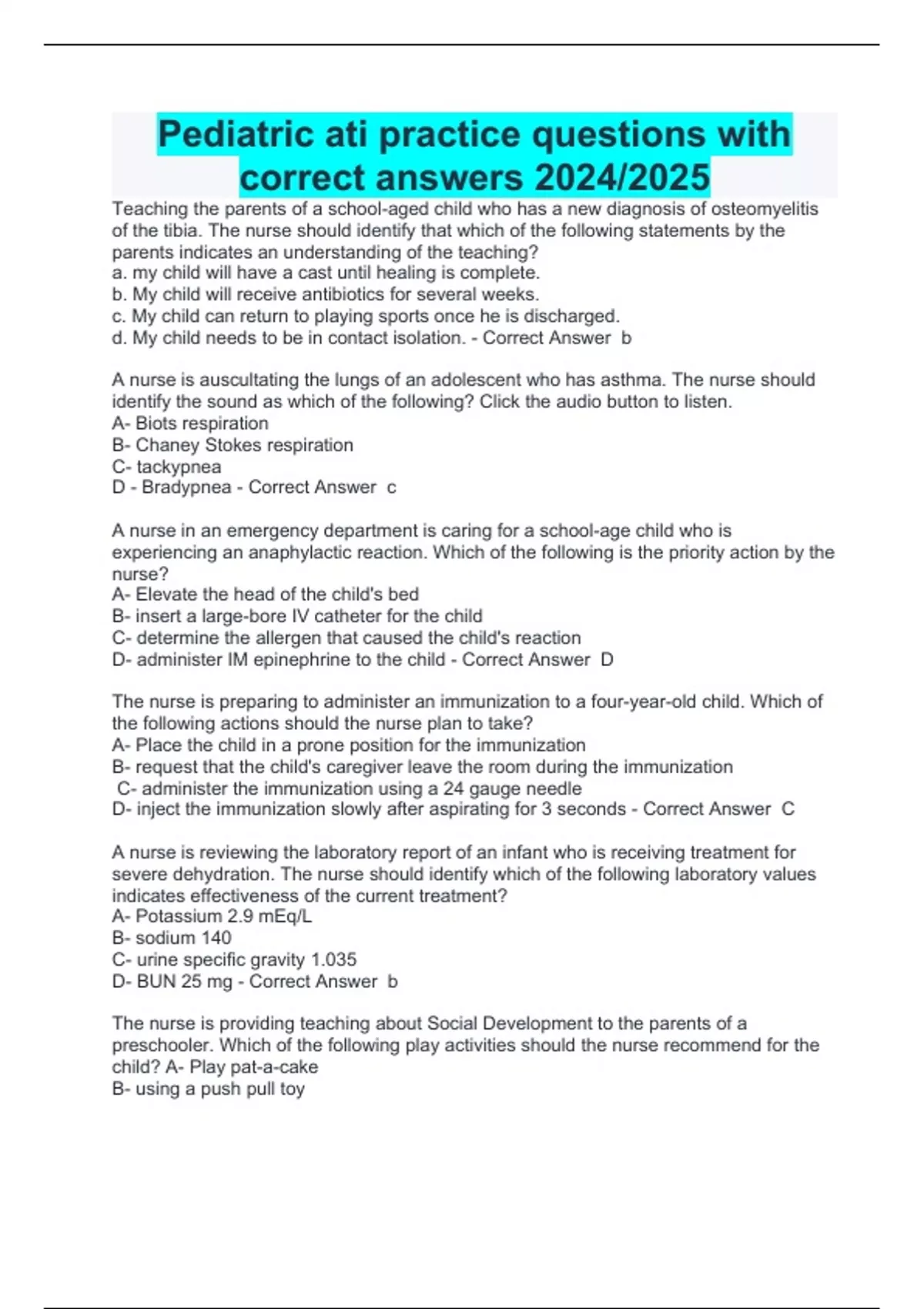 Pediatric ati practice questions with correct answers 2024/2025 Teaching the parents of a school-aged child who has a new diagnosis of osteomyelitis of the tibia. The nurse should identify that which of the following statements by the parents indicates an understanding of the teaching? a. my child will have a cast until healing is complete. b. My child will receive antibiotics for several weeks. c. My child can return to playing sports once he is discharged. d. My child needs to be in contact isolation. - Correct Answer b A nurse is auscultating the lungs of an adolescent who has asthma. The nurse should identify the sound as which of the following? Click the audio button to listen. A- Biots respiration B- Chaney Stokes respiration C- tackypnea D - Bradypnea - Correct Answer c A nurse in an emergency department is caring for a school-age child who is experiencing an anaphylactic reaction. Which of the following is the priority action by the nurse? A- Elevate the head of the child's bed B- insert a large-bore IV catheter for the child C- determine the allergen that caused the child's reaction D- administer IM epinephrine to the child - Correct Answer D The nurse is preparing to administer an immunization to a four-year-old child. Which of the following actions should the nurse plan to take? A- Place the child in a prone position for the immunization B- request that the child's caregiver leave the room during the immunization C- administer the immunization using a 24 gauge needle D- inject the immunization slowly after aspirating for 3 seconds - Correct Answer C A nurse is reviewing the laboratory report of an infant who is receiving treatment for severe dehydration. The nurse should identify which of the following laboratory values indicates effectiveness of the current treatment? A- Potassium 2.9 mEq/L B- sodium 140 C- urine specific gravity 1.035