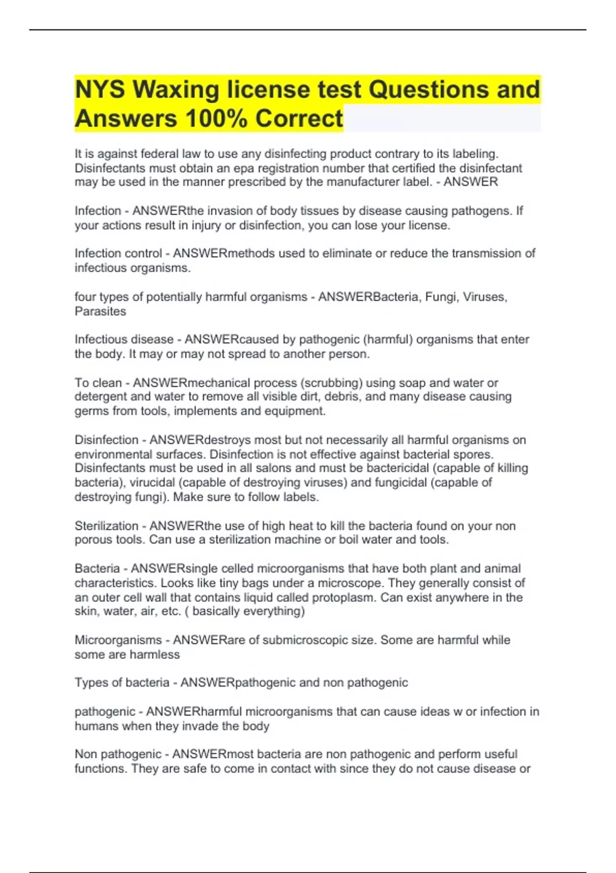 NYS Waxing license test Questions and Answers 100% Correct