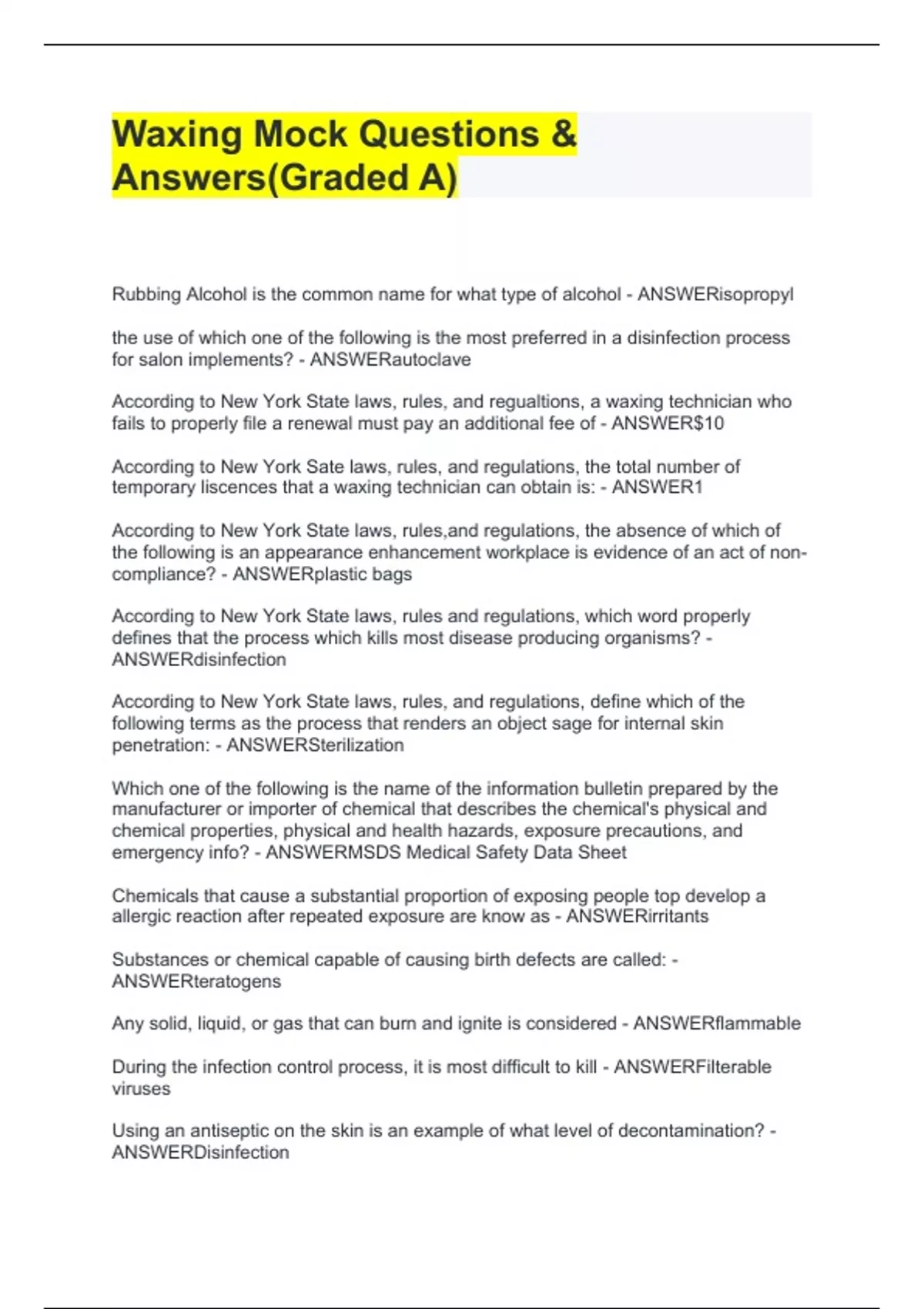 Rubbing Alcohol is the common name for what type of alcohol - ANSWERisopropyl the use of which one of the following is the most preferred in a disinfection process for salon implements? - ANSWERautoclave According to New York State laws, rules, and regualtions, a waxing technician who fails to properly file a renewal must pay an additional fee of - ANSWER$10 According to New York Sate laws, rules, and regulations, the total number of temporary liscences that a waxing technician can obtain is: - ANSWER1 According to New York State laws, rules,and regulations, the absence of which of the following is an appearance enhancement workplace is evidence of an act of non-compliance? - ANSWERplastic bags According to New York State laws, rules and regulations, which word properly defines that the process which kills most disease producing organisms? - ANSWERdisinfection According to New York State laws, rules, and regulations, define which of the following terms as the process that renders an object sage for internal skin penetration: - ANSWERSterilization Which one of the following is the name of the information bulletin prepared by the manufacturer or importer of chemical that describes the chemical's physical and chemical properties, physical and health hazards, exposure precautions, and emergency info? - ANSWERMSDS Medical Safety Data Sheet Chemicals that cause a substantial proportion of exposing people top develop a allergic reaction after repeated exposure are know as - ANSWERirritants Substances or chemical capable of causing birth defects are called: - ANSWERteratogens