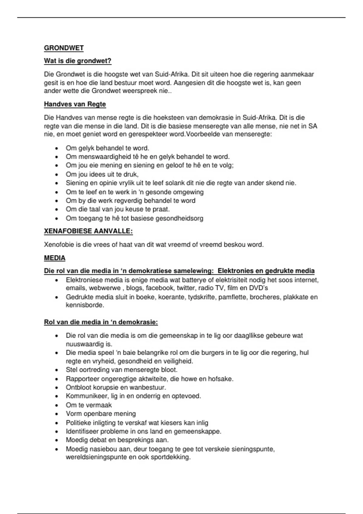 • Siening en opinie vrylik uit te leef solank dit nie die regte van ander skend nie.