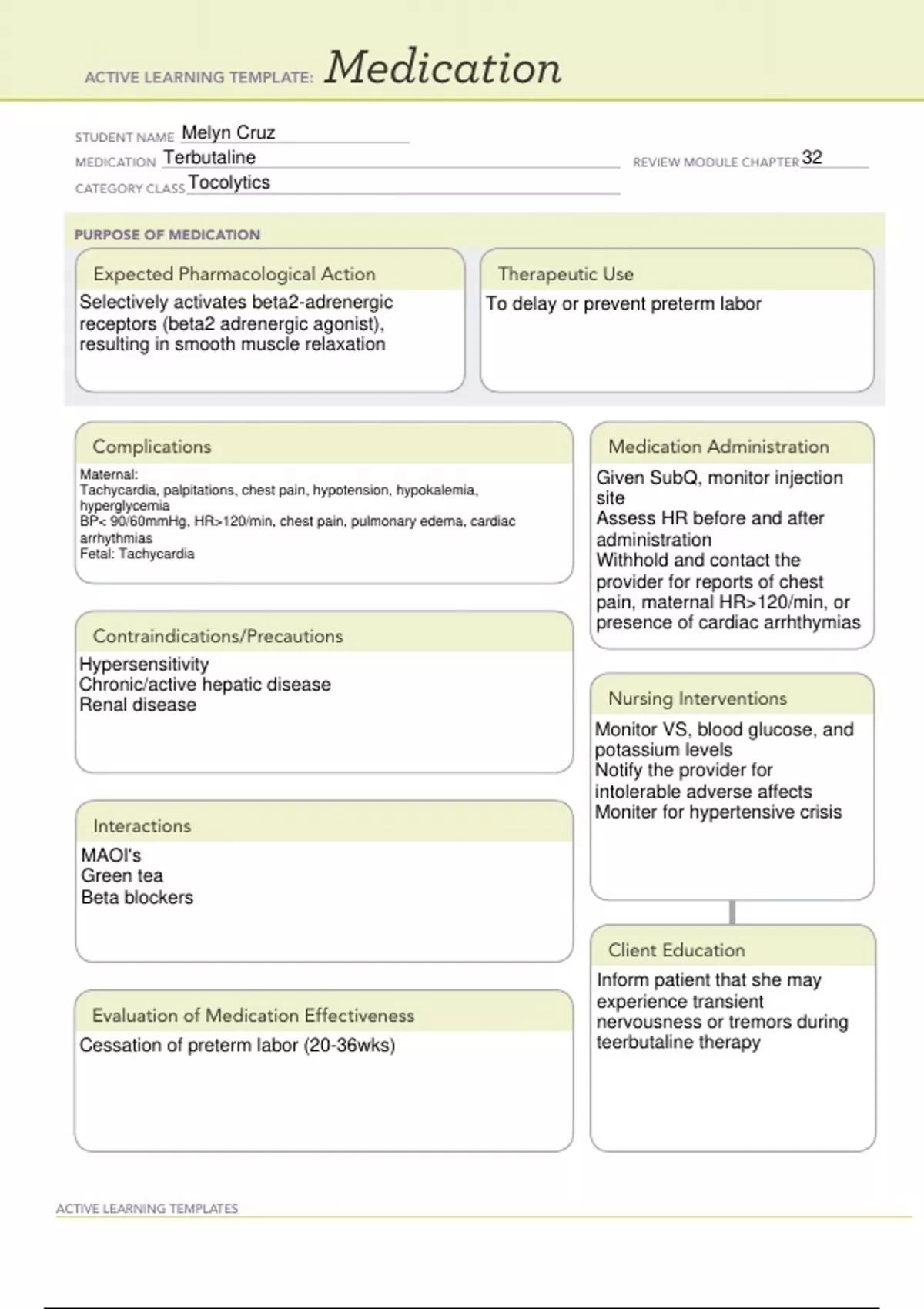 Selectively activates beta2-adrenergic receptors (beta2 adrenergic agonist), resulting in smooth muscle relaxation Given SubQ, monitor injection site Assess HR before and after administration Withhold and contact the provider for reports of chest pain, maternal HR120/min, or presence of cardiac arrhthymias MAOI's Green tea Beta blockers Hypersensitivity Chronic/active hepatic disease Renal disease Maternal: Tachycardia, palpitations, chest pain, hypotension, hypokalemia, hyperglycemia BP 90/60mmHg, HR120/min, chest pain, pulmonary e