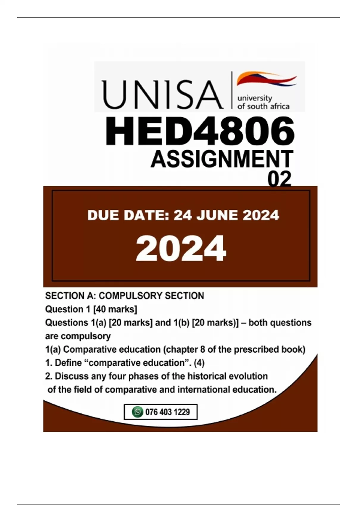 HED4806 ASSIGNMENT 02..DUE 24 JUNE 2024...Unique Number: 752085 SECTION A: COMPULSORY SECTION Question 1 [40 marks] Questions 1(a) [20 marks] and 1(b) [20 marks)] – both questions are compulsory 1(a) Comparative education (chapter 8 of the prescribed book) 1. Define “comparative education”. (4)