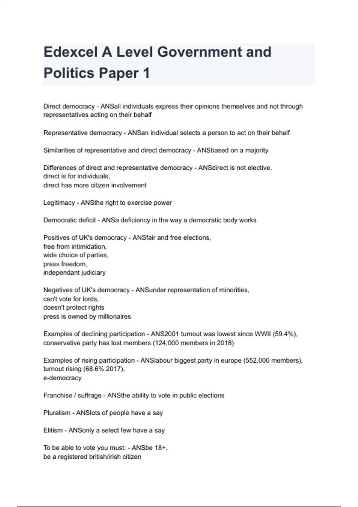 Edexcel A Level Government and Politics Paper 1