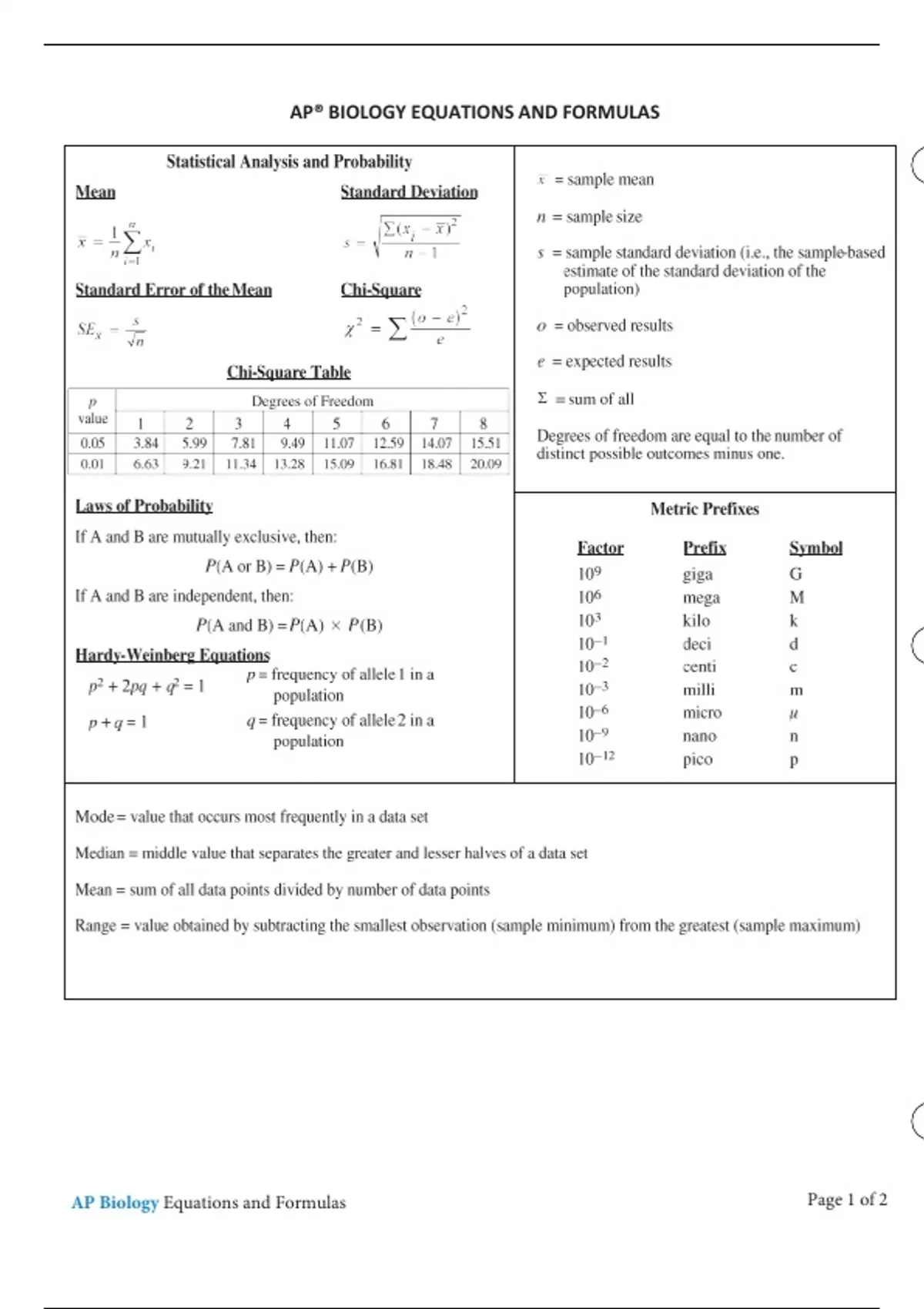 AP Biology Exam Equations and Formulas