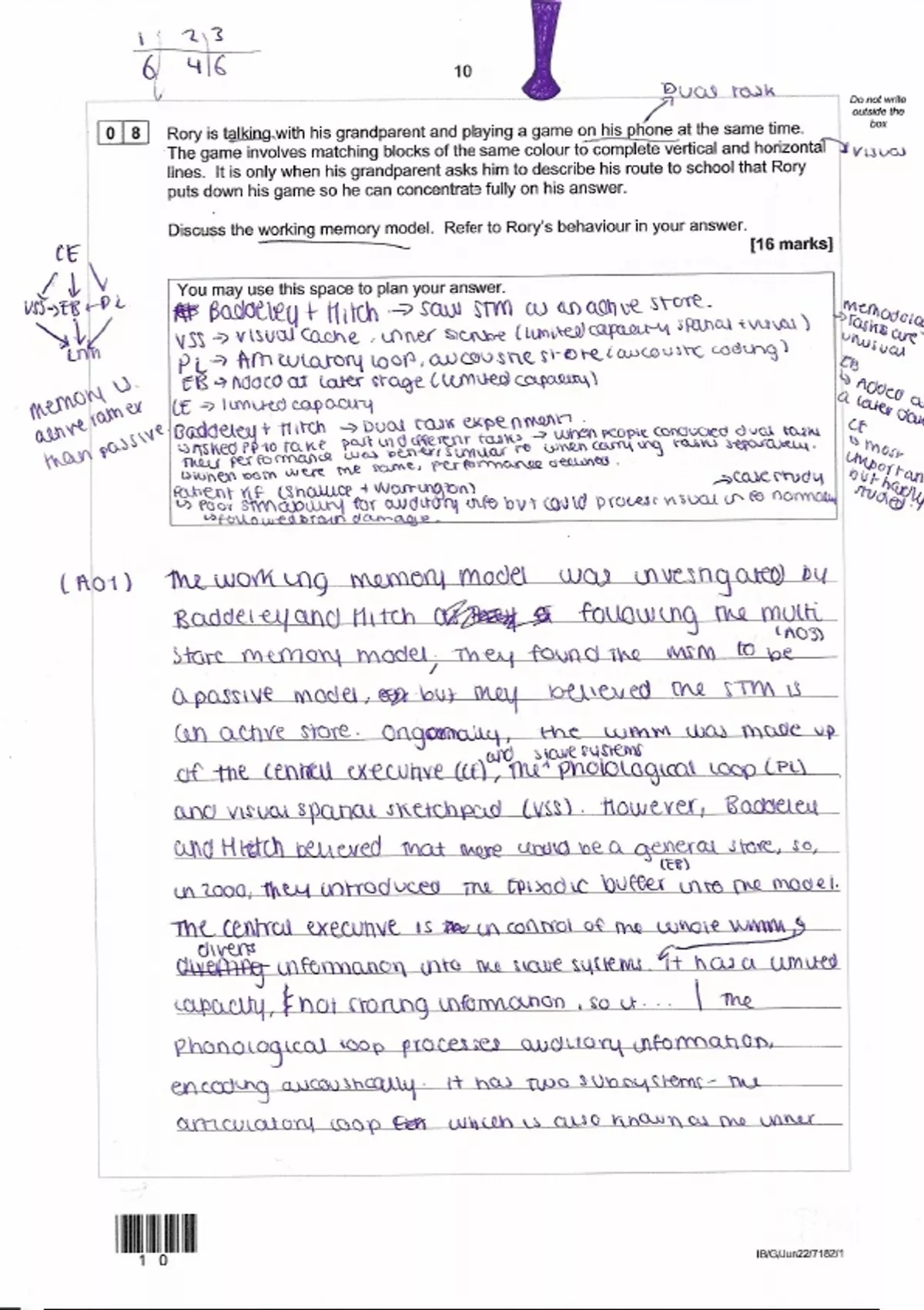 Handwritten 16 marker for topic of memory, WMM, AQA psychology. This is not marked, only there to help you see my structure. Helped me with my recent exams. Great to print off and put on walls, or to even structure answers.