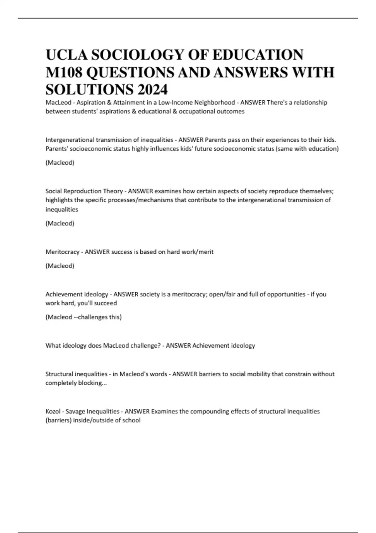 UCLA SOCIOLOGY OF EDUCATION M108 QUESTIONS AND ANSWERS WITH SOLUTIONS 2024