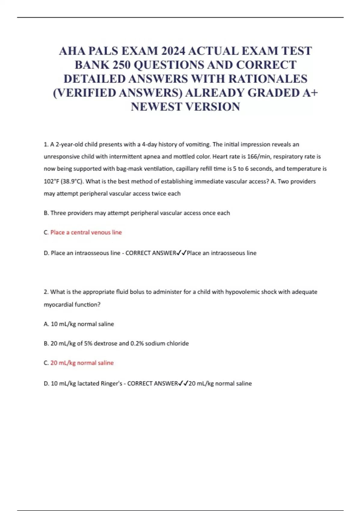AHA PALS EXAM 2024 ACTUAL EXAM TEST BANK 250 QUESTIONS AND CORRECT DETAILED ANSWERS WITH RATIONALES (VERIFIED ANSWERS) ALREADY GRADED A+ NEWEST VERSION