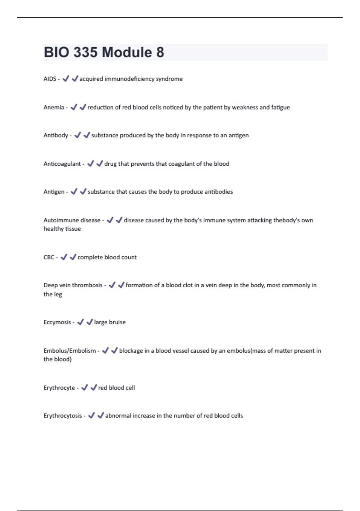AIDS - acquired immunodeficiency syndrome Anemia - reduction of red blood cells noticed by the patient by weakness and fatigue Antibody - substance produced by the body in response to an antigen Anticoagulant - drug that prevents that coagulant of the blood Antigen - substance that causes the body to produce antibodies Autoimmune disease - disease caused by the body's immune system attacking thebody's own healthy tissue CBC - complete blood count Deep vein thrombosis - formation of a blood clot in a vein deep in the body, most commonly in the leg Eccymosis - large bruise Embolus/Embolism - blockage in a blood vessel caused by an embolus(mass of matter present in the blood) Erythrocyte - red blood cell Erythrocytosis - abnormal increase in the number of red blood cellsESR - erythrocyte sedimentation rate Hct - hematocrit