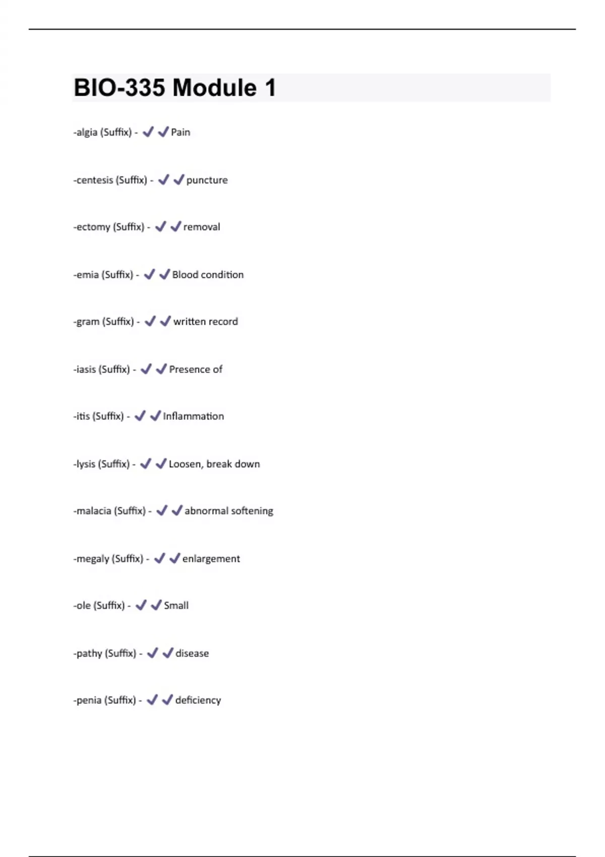 algia (Suffix) - Pain -centesis (Suffix) - puncture -ectomy (Suffix) - removal -emia (Suffix) - Blood condition -gram (Suffix) - written record -iasis (Suffix) - Presence of -itis (Suffix) - Inflammation -lysis (Suffix) - Loosen, break down -malacia (Suffix) - abnormal softening -megaly (Suffix) - enlargement -ole (Suffix) - Small -pathy (Suffix) - disease -penia (Suffix) - deficiency-plasty (Suffix) - Reconstruction -ptosis (Suffix) - drooping -rrapphy (Suffix) - Suture -rrhage (Suffix) - excessive flow