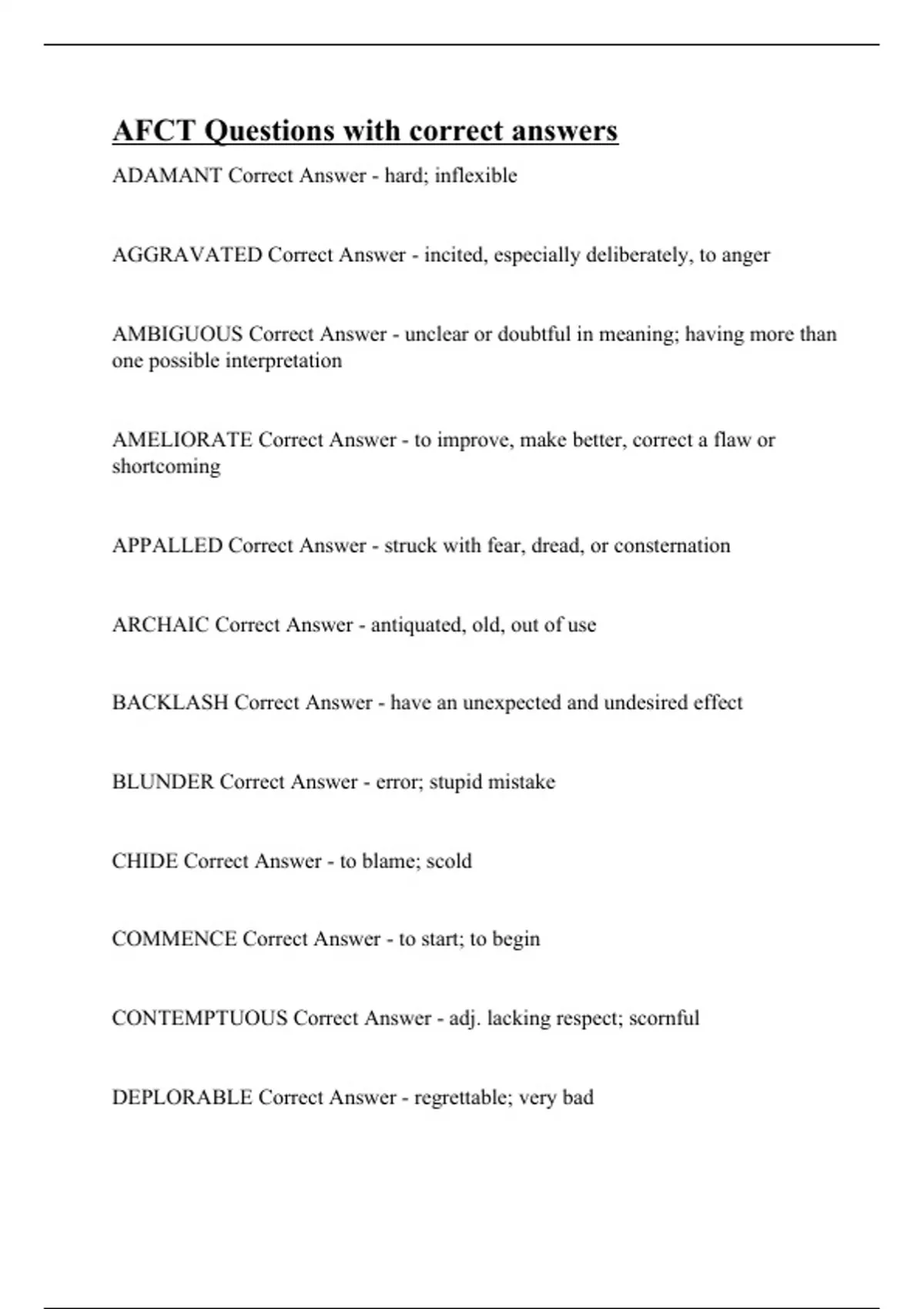 ADAMANT Correct Answer - hard; inflexible AGGRAVATED Correct Answer - incited, especially deliberately, to anger AMBIGUOUS Correct Answer - unclear or doubtful in meaning; having more than one possible interpretation AMELIORATE Correct Answer - to improve, make better, correct a flaw or shortcoming APPALLED Correct Answer - struck with fear, dread, or consternation ARCHAIC Correct Answer - antiquated, old, out of use BACKLASH Correct Answer - have an unexpected and undesired effect BLUNDER Correct Answer - error; stupid mistake CHIDE Correct Answer - to blame; scold COMMENCE Correct Answer - to start; to begin CONTEMPTUOUS Correct Answer - adj. lacking respect; scornful DEPLORABLE Correct Answer - regrettable; very bad