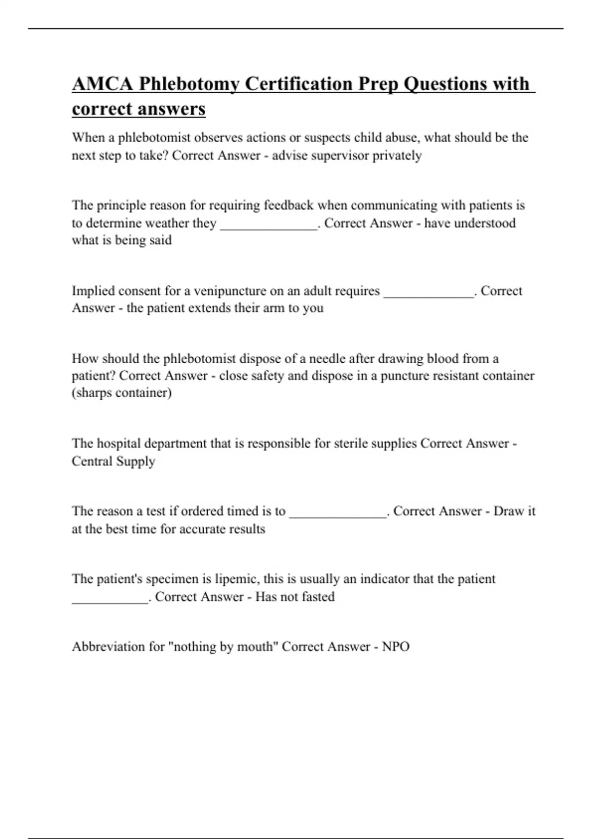 Implied consent for a venipuncture on an adult requires _____________. Correct Answer - the patient extends their arm to you