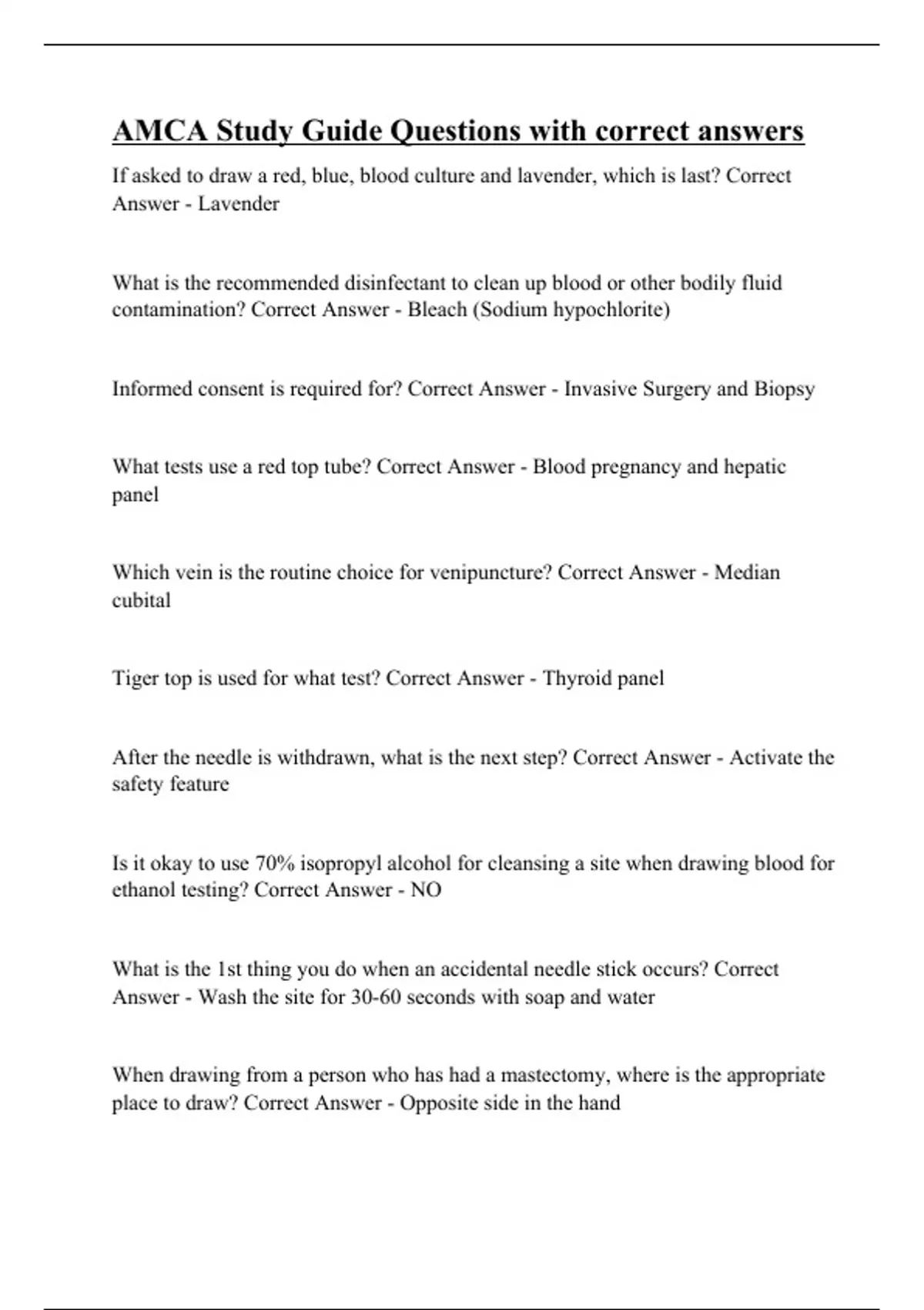 If asked to draw a red, blue, blood culture and lavender, which is last? Correct Answer - Lavender What is the recommended disinfectant to clean up blood or other bodily fluid contamination? Correct Answer - Bleach (Sodium hypochlorite) Informed consent is required for? Correct Answer - Invasive Surgery and Biopsy What tests use a red top tube? Correct Answer - Blood pregnancy and hepatic panel Which vein is the routine choice for venipuncture? Correct Answer - Median cubital Tiger top is used for what test? Correct Answer - Thyroid panel After the needle is withdrawn, what is the next step? Correct Answer - Activate the safety feature Is it okay to use 70% isopropyl alcohol for cleansing a site when drawing blood for ethanol testing? Correct Answer - NO What is the 1st thing you do when an accidental needle stick occurs? Correct Answer - Wash the site for 30-60 seconds with soap and water When drawing from a person who has had a mastectomy, where is the appropriate place to draw? Correct Answer - Opposite side in the hand