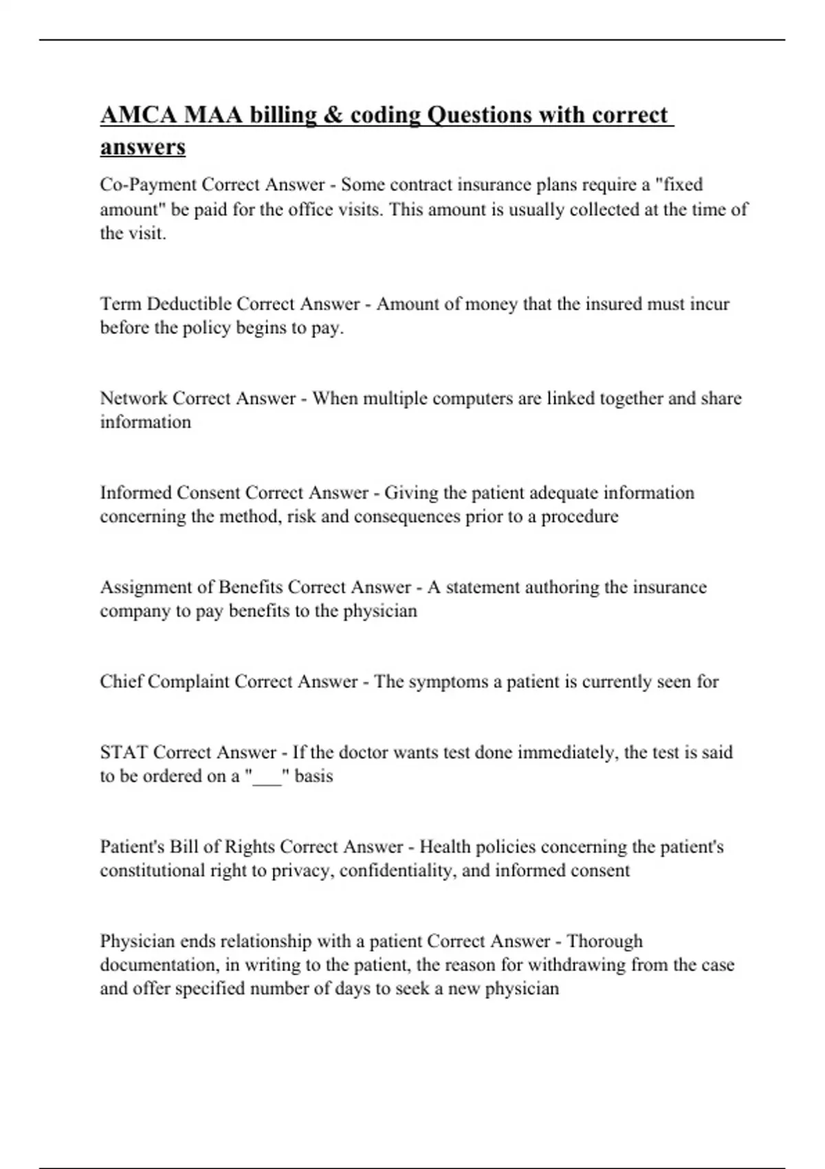 Co-Payment Correct Answer - Some contract insurance plans require a "fixed amount" be paid for the office visits. This amount is usually collected at the time of the visit. Term Deductible Correct Answer - Amount of money that the insured must incur before the policy begins to pay. Network Correct Answer - When multiple computers are linked together and share information Informed Consent Correct Answer - Giving the patient adequate information concerning the method, risk and consequences prior to a procedure Assignment of Benefits Correct Answer - A statement authoring the insurance company to pay benefits to the physician Chief Complaint Correct Answer - The symptoms a patient is currently seen for STAT Correct Answer - If the doctor wants test done immediately, the test is said to be ordered on a "___" basis Patient's Bill of Rights Correct Answer - Health policies concerning the patient's constitutional right to privacy, confidentiality, and informed consent