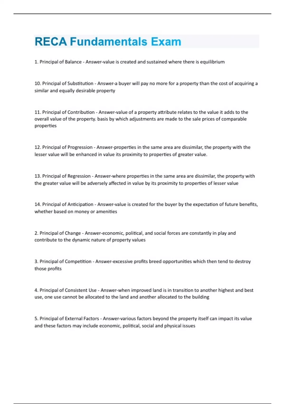 1. Principal of Balance - Answer-value is created and sustained where there is equilibrium 10. Principal of Substitution - Answer-a buyer will pay no more for a property than the cost of acquiring a similar and equally desirable property 11. Principal of Contribution - Answer-value of a property attribute relates to the value it adds to the overall value of the property. basis by which adjustments are made to the sale prices of comparable properties 12. Principal of Progression - Answer-properties in the same area are dissimilar, the property with the lesser value will be enhanced in value its proximity to properties of greater value. 13. Principal of Regression - Answer-where properties in the same area are dissimilar, the property with the greater value will be adversely affected in value by its proximity to properties of lesser value 14. Principal of Anticipation - Answer-value is created for the buyer by the expectation of future benefits, whether based on money or amenities 2. Principal of Change - Answer-economic, political, and social forces are constantly in play and contribute to the dynamic nature of property values 3. Principal of Competition - Answer-excessive profits breed opportunities which then tend to destroy those profits 4. Principal of Consistent Use - Answer-when improved land is in transition to another highest and best use, one use cannot be allocated to the land and another allocated to the building 5. Principal of External Factors - Answer-various factors beyond the property itself can impact its value and these factors may include economic, political, social and physical issues6. Principal of Increasing/decreasing return - Answer-capital improvements add value to a property to a certain point 7. Principal of Surplus productivity - Answer-factors of production that generate net income, which is then attributed to the land and tends to set the value 8. Principal of Supply and Demand - Answer-market value is determined by the interaction of market forces such as the quantity of available properties and the interest of buyers able to purchase them 9. Principal of highest and best use - Answer-considers legal permissibility, physical possibility, financial feasibility and maximum productivity
