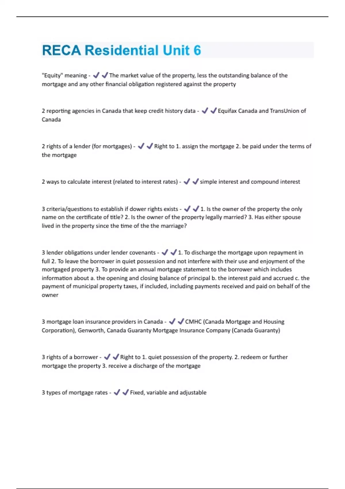 "Equity" meaning - The market value of the property, less the outstanding balance of the mortgage and any other financial obligation registered against the property 2 reporting agencies in Canada that keep credit history data - Equifax Canada and TransUnion of Canada 2 rights of a lender (for mortgages) - Right to 1. assign the mortgage 2. be paid under the terms of the mortgage 2 ways to calculate interest (related to interest rates) - simple interest and compound interest 3 criteria/questions to establish if dower rights exists - 1. Is the owner of the property the only name on the certificate of title? 2. Is the owner of the property legally married? 3. Has either spouse lived in the property since the time of the the marriage? 3 lender obligations under lender covenants - 1. To discharge the mortgage upon repayment in full 2. To leave the borrower in quiet possession and not interfere with their use and enjoyment of the mortgaged property 3. To provide an annual mortgage statement to the borrower which includes information about a. the opening and closing balance of principal b. the interest paid and accrued c. the payment of municipal property taxes, if included, including payments received and paid on behalf of the owner 3 mortgage loan insurance providers in Canada - CMHC (Canada Mortgage and Housing Corporation), Genworth, Canada Guaranty Mortgage Insurance Company (Canada Guaranty) 3 rights of a borrower - Right to 1. quiet possession of the property. 2. redeem or further mortgage the property 3. receive a discharge of the mortgage 3 types of mortgage rates - Fixed, variable and adjustable5 basic steps of a foreclosure process - 1. Borrower defaults 2. Lender issues Demand Letter. 3. Lender files Statement of Claim 4. Borrower responds to Statement of Claim 5. Lender files a Motion for Foreclosure Relief 5a. Lender applies for Redemption Order b. Lender applies for Order for Sale to Plaintiff c. Lender applies for Order for Foreclosure 5 covenants under Borrower's Obligation - Covenant to 1. repay the mortgage loan and accrued interest. 2. pay all taxes levied upon the property 3. keep the property adequately insured 4. maintain the condition of the property 5. pay any other charges against the title of the property