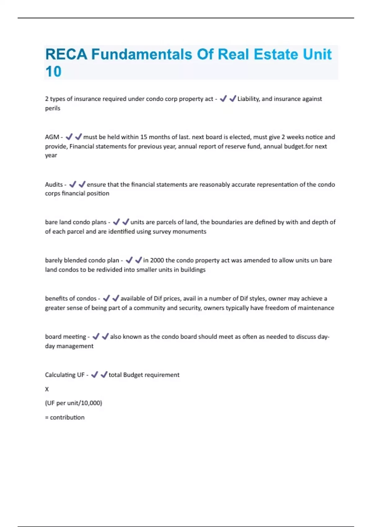 2 types of insurance required under condo corp property act - Liability, and insurance against perils AGM - must be held within 15 months of last. next board is elected, must give 2 weeks notice and provide, Financial statements for previous year, annual report of reserve fund, annual next year Audits - ensure that the financial statements are reasonably accurate representation of the condo corps financial position bare land condo plans - units are parcels of land, the boundaries are defined by with and depth of of each parcel and are identified using survey monuments barely blended condo plan - in 2000 the condo property act was amended to allow units un bare land condos to be redivided into smaller units in buildings benefits of condos - available of Dif prices, avail in a number of Dif styles, owner may achieve a greater sense of being part of a community and security, owners typically have freedom of maintenance board meeting - also known as the condo board should meet as often as needed to discuss dayday management Calculating UF - total Budget requirement X (UF per unit/10,000) = contributioncertificate of insurance - purpose is to protect against damages and loss, typically unexpected, unintentional, or accidental, comercial condos - office towner (doctors)